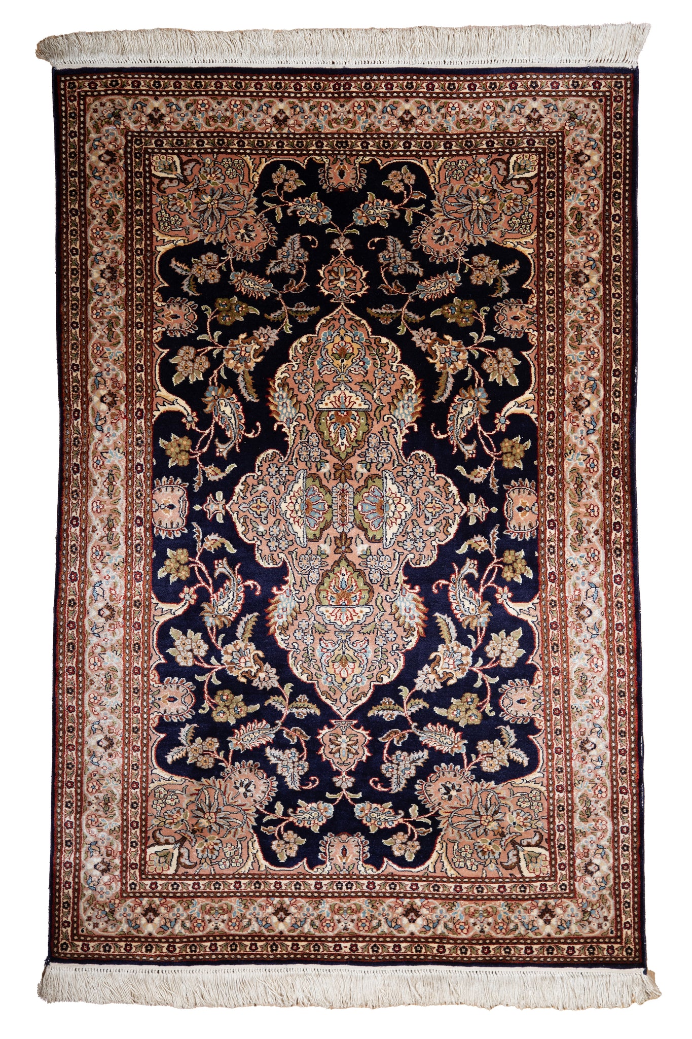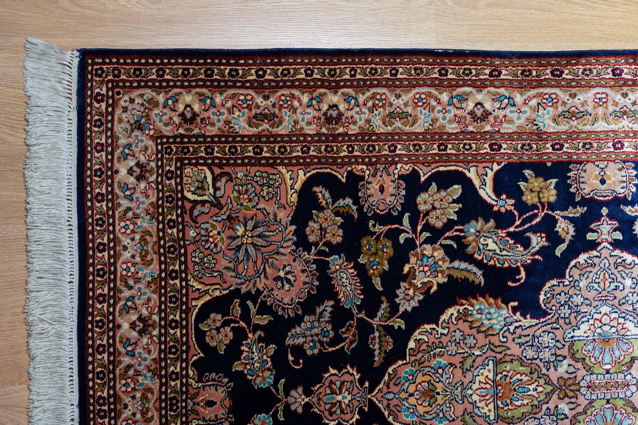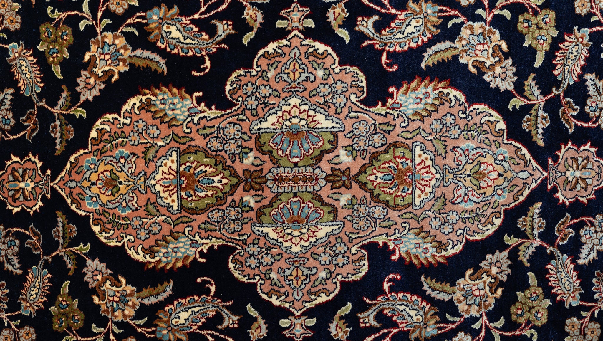 Presenting the Kashmir Mulberry Silk Rug – Midnight Bloom, a pinnacle of elegance and craftsmanship woven with the finest mulberry silk on silk and featuring a very high knot count for exceptional precision and finesse. The deep navy blue field forms a rich, luxurious backdrop for an elaborate central medallion in pastel peach, rose gold, sage, and ivory tones. Delicate floral vines and paisley motifs radiate symmetrically across the rug, each petal and leaf meticulously detailed, embodying the legendary artistry of Kashmir. The warm ivory and coral-toned border frames the composition beautifully, creating a regal contrast that enhances the rug’s ornate presence. This heirloom-quality piece is perfect for collectors, connoisseurs, or those seeking to infuse their spaces with timeless beauty and sophistication. Whether placed in a grand drawing room or a luxury suite, this Kashmir silk rug transforms any interior into a haven of artistry, heritage, and enduring charm.