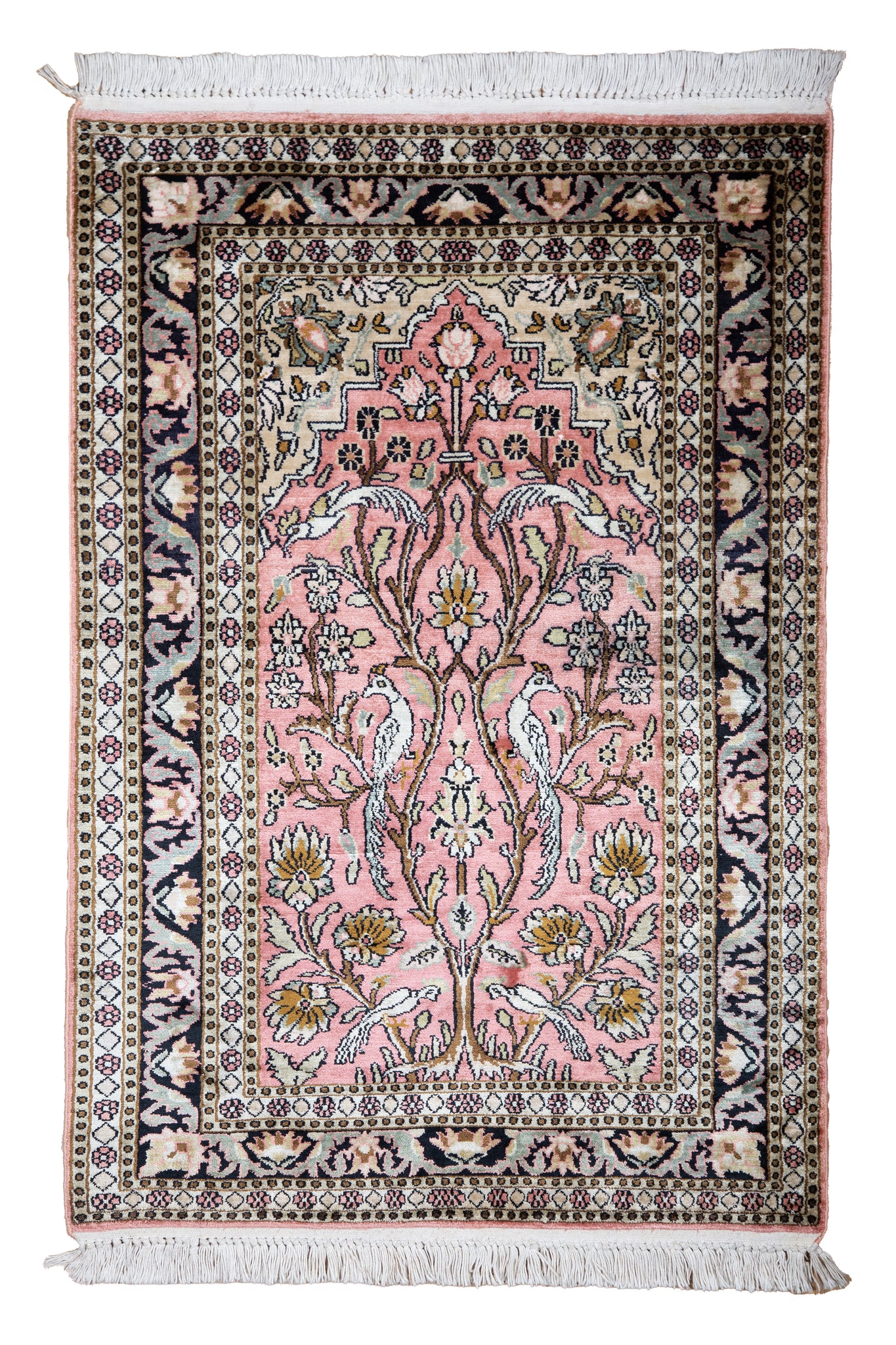 Delicate, refined, and full of poetic charm, this pure silk rug from Kashmir is hand-knotted with a very high knot count, resulting in exceptional clarity and intricate detailing. Set against a rare and elegant blush pink backdrop, the design celebrates nature’s harmony with a symmetrical tree of life pattern, adorned with blooming flowers and graceful birds perched along winding vines. The soothing palette—featuring soft gold, ivory, sage, and navy—offers a visual calm, while the silk threads add an iridescent sheen, bringing the artwork to life as light plays across its surface. The meticulously woven floral border frames the composition beautifully, adding both contrast and continuity. This rug is not just a piece of décor—it’s a whisper of paradise, rooted in centuries-old Kashmiri weaving tradition. Ideal for intimate spaces or collector's corners, this is a timeless treasure for those who seek luxury with soul and meaning in every thread.