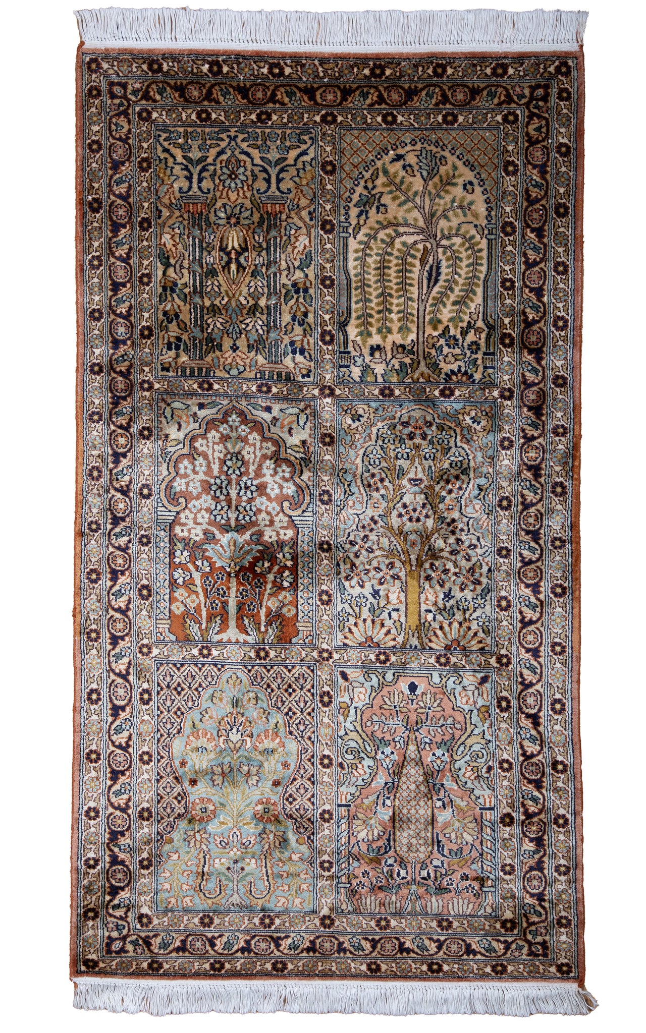 This exquisite pure silk rug from Kashmir is a remarkable showcase of the traditional Garden Panel or Dabdaar design, known for its symbolic beauty and storytelling elegance. Hand-knotted with an exceptionally high knot count, this masterpiece displays six intricately woven arched panels, each featuring a unique tree, floral motif, or peacock—symbolizing life, paradise, and nature’s bounty. The soft, harmonious palette includes hues of ivory, sky blue, sage green, rust, peach, gold, and indigo, creating a serene yet vibrant aesthetic. The fine silk gives the rug a lustrous glow, accentuating every detail with elegance and depth. A meticulously patterned border encases the design, enhancing its architectural symmetry. This rug is ideal for collectors and those looking to elevate their interiors with a timeless piece of Kashmiri artistry. Perfect for display in formal living rooms or personal sanctuaries, it’s a celebration of heritage, craftsmanship, and cultural richness woven into every knot.