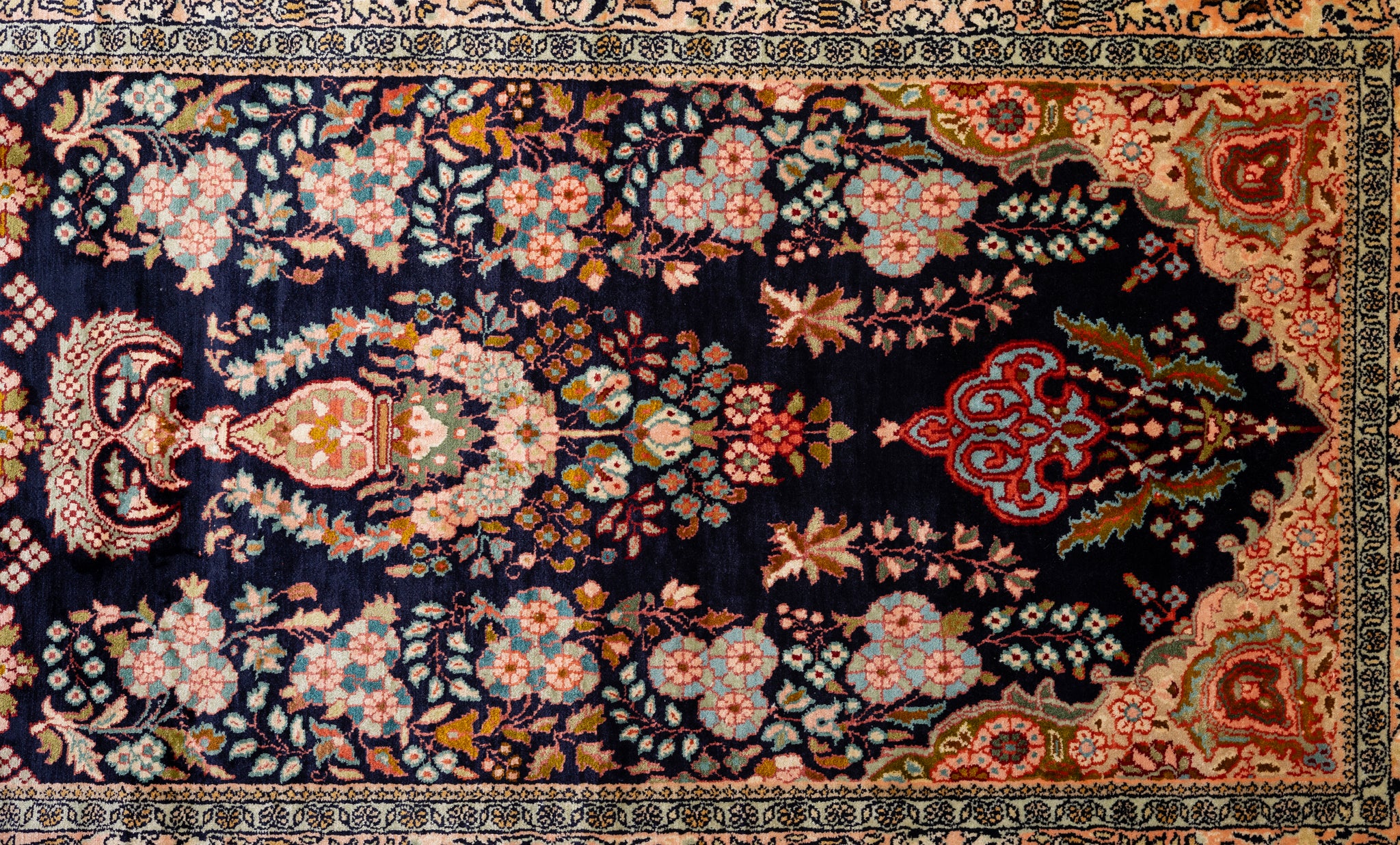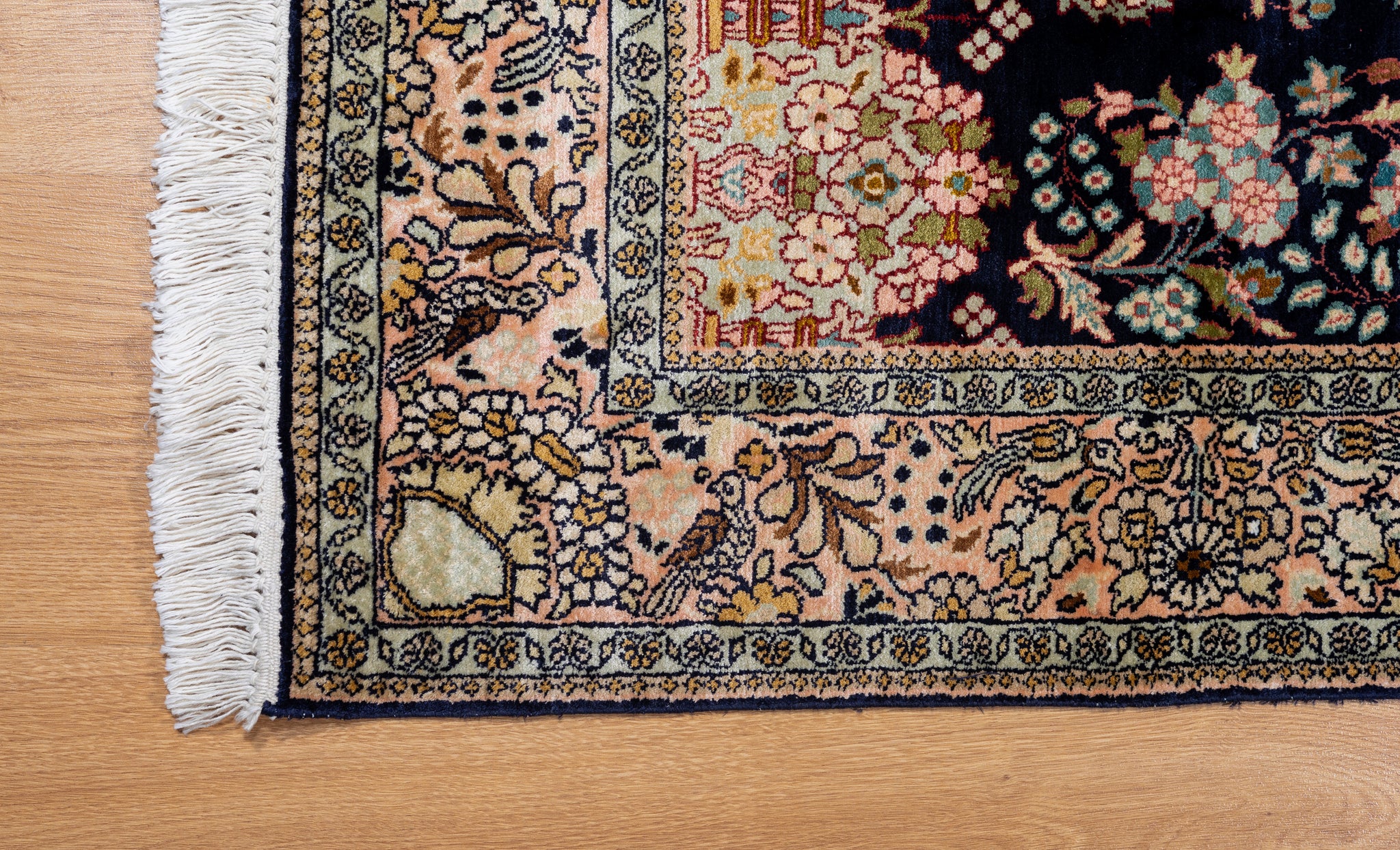 Experience timeless artistry with this luxurious Kashmir Silk Rug – Midnight Garden, hand-knotted with an exceptionally high knot count for unmatched finesse. Crafted from pure silk on silk, this masterpiece showcases a breathtaking “Tree of Life” design blossoming in a symmetrical pattern across a rich midnight blue field. Graceful floral motifs and elegant birds of paradise rise from an intricately woven central vase, symbolizing abundance, beauty, and harmony. Delicate hues of ivory, rose pink, pistachio green, and gold shimmer against the deep backdrop, adding contrast and elegance to any interior space. The intricately detailed border in warm ivory and peach tones features a flowing vine pattern, framing the central medallion beautifully. This Kashmiri silk rug is not only a work of art but a legacy of craftsmanship, ideal for collectors and connoisseurs of handmade rugs. Perfect for luxurious living spaces, prayer rooms, or as a signature décor piece that speaks volumes of heritage and refinement.