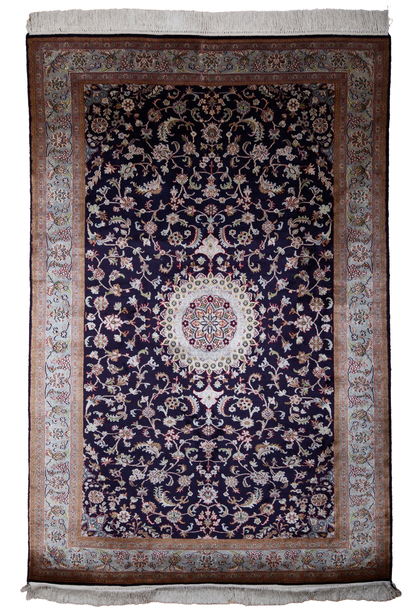 Presenting the Kashmir Silk Rug – Midnight Medallion Bloom, a breathtaking silk-on-silk creation from the legendary looms of Kashmir. Hand-knotted with an exceptionally high knot count, this rug showcases the meticulous craftsmanship and intricate detailing that define Kashmiri artistry. At the heart lies a luminous floral medallion surrounded by a symphony of swirling vines, blooming flowers, and balanced motifs—expertly woven in shades of ivory, blush pink, moss green, and gold. The deep midnight blue field adds regal depth, making the patterns appear to float like a garden under moonlight. An elegant sky-blue border with stylized florals creates the perfect frame, enhancing the central drama with contrast and sophistication. The pure silk pile shimmers with a luxurious sheen, transforming light into texture and depth. Ideal for refined living spaces, prayer rooms, or wall display, this masterpiece is a true blend of heritage, harmony, and high design—crafted to be cherished for generations.