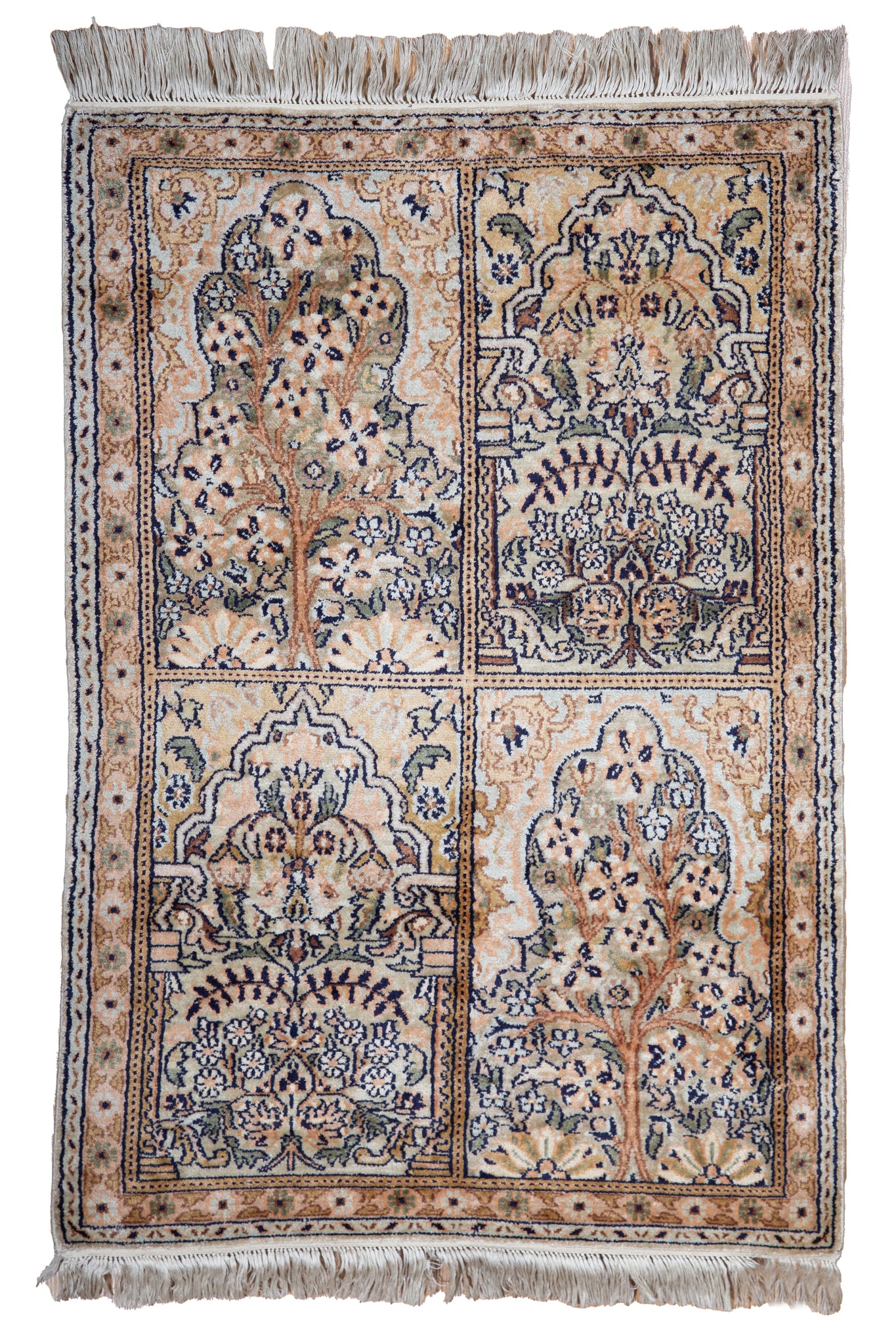 Elevate your space with the sophisticated elegance of this Kashmir Silk Rug – Radiant Floral Legacy, crafted using the finest silk and showcasing a high knot count that ensures intricate details and luxurious texture. This exquisite rug features a unique design split into four panels, each adorned with flourishing trees and vibrant floral motifs that evoke the timeless beauty of nature. The rich, warm peach and gold tones of the background create a soft, inviting atmosphere, while the contrasting deep blues and greens of the foliage bring depth and vibrancy to the rug’s design. Each panel is bordered with delicate floral patterns, further enhancing the rug's regal aesthetic. Perfect for living rooms, dining areas, or as a statement piece in a hallway, this Kashmir silk rug is a testament to the unparalleled artistry of Kashmiri weavers. Bring the beauty of nature and fine craftsmanship into your home with this one-of-a-kind treasure.
