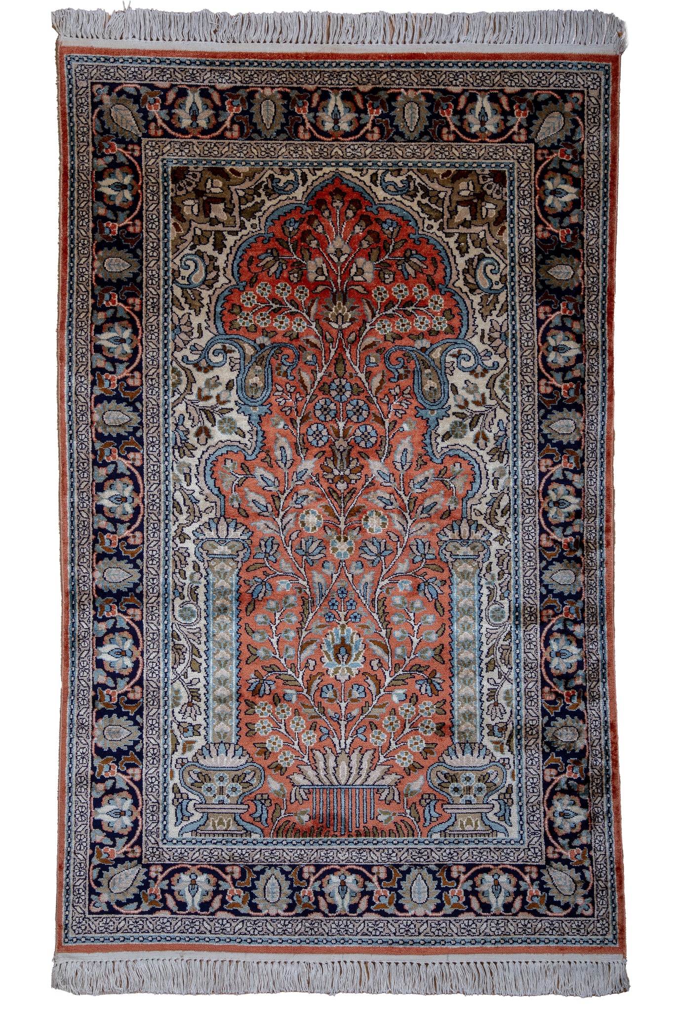 This exquisite Kashmir Silk Rug – Royal Tree of Paradise is a breathtaking silk-on-silk marvel, hand-knotted with an exceptionally high knot count to ensure unmatched detailing and texture. At the heart of this masterpiece lies the majestic Tree of Life design, framed by elegant architectural columns and flourishing from an ornate base urn. Woven in rich tones of terracotta, sapphire, ivory, and teal, the design symbolizes eternal growth, abundance, and harmony. Every branch is adorned with delicately rendered floral blooms, while the intricate navy and ivory border creates the perfect regal frame. Crafted from 100% pure silk by the master artisans of Kashmir, this rug glows with a luxurious sheen that shifts under changing light. Whether placed in a formal setting, meditation corner, or used as a wall hanging, this rug transforms any space into a sanctuary of timeless beauty. Own a piece of woven heritage and bring paradise into your home.