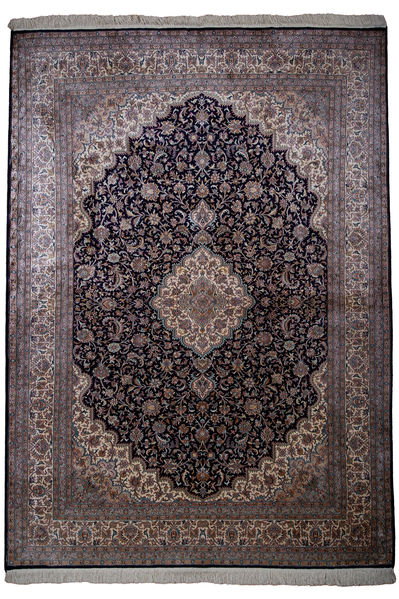 An exquisite example of Persian elegance, this Kashan silk-on-silk carpet showcases an intricate floral medallion design set against a deep midnight navy field. Masterfully hand-knotted using the finest natural silk, its lustrous surface reveals an exceptional clarity of detail, with delicate vines, blossoms, and arabesques unfolding in shades of ivory, rosewood, copper, and jade. The opulent border frames the piece with timeless harmony, inspired by classical Safavid motifs. This heirloom-quality rug captures the finesse of traditional Kashan weaving and is perfect for refined interiors that celebrate art, heritage, and luxury. A statement of true connoisseurship and enduring beauty.