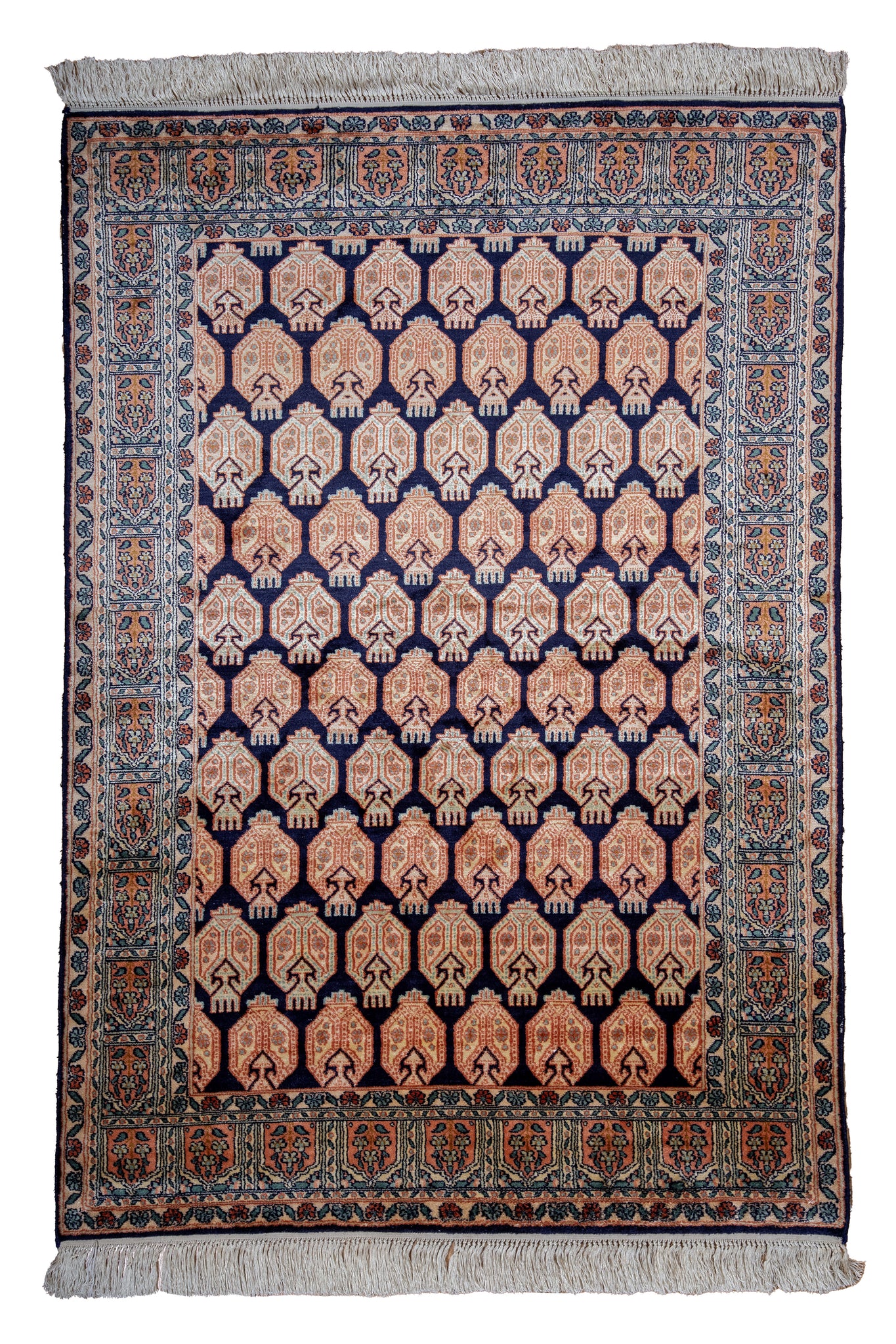 This exquisite Midnight Boteh Kashmiri Silk Masterpiece showcases masterful craftsmanship and timeless elegance. Hand-knotted with a remarkably high knot count, this silk-on-silk creation is a testament to precision and luxury. The design features an enchanting lattice of boteh (paisley) motifs arranged in a mesmerizing grid, set against a rich midnight blue base. Shades of saffron, peach, ivory, and burnt orange interplay beautifully with navy to create a harmonious geometric pattern that is both classic and contemporary. The intricate floral borders in shades of blue and terracotta add depth and ornate framing, enhancing the symmetry of the field. This rug reflects the influence of Persian Qum aesthetics while preserving the finesse of Kashmiri artistry. Perfect for formal living areas or as a centerpiece in a curated space, this rug adds a regal touch to any interior. A collector's piece and a design statement — ideal for lovers of fine craftsmanship.