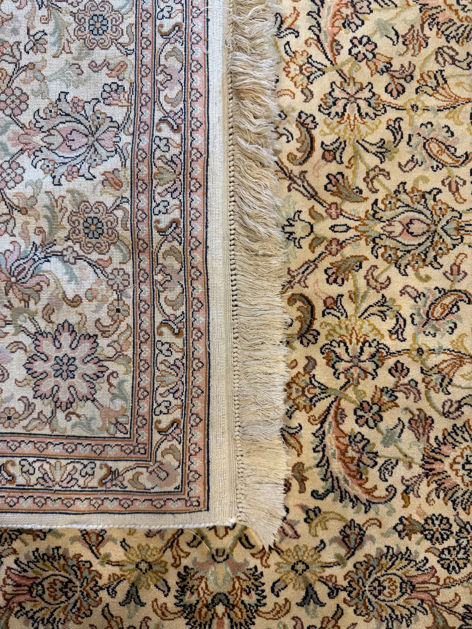This Kashmiri silk millefleurs rug is a masterpiece of precision and elegance, hand-knotted from the finest mulberry silk. The intricate millefleurs (“thousand flowers”) design blooms across the ivory field, symbolizing abundance and eternal beauty. Each knot radiates sheen and detail, showcasing Kashmir’s unmatched weaving heritage. Ideal for luxury interiors, this silk rug adds warmth, refinement, and timeless sophistication to any space. Perfect for collectors and connoisseurs seeking authentic craftsmanship, its soft texture, floral medallions, and harmonious color palette make it a statement of heritage and grace.
