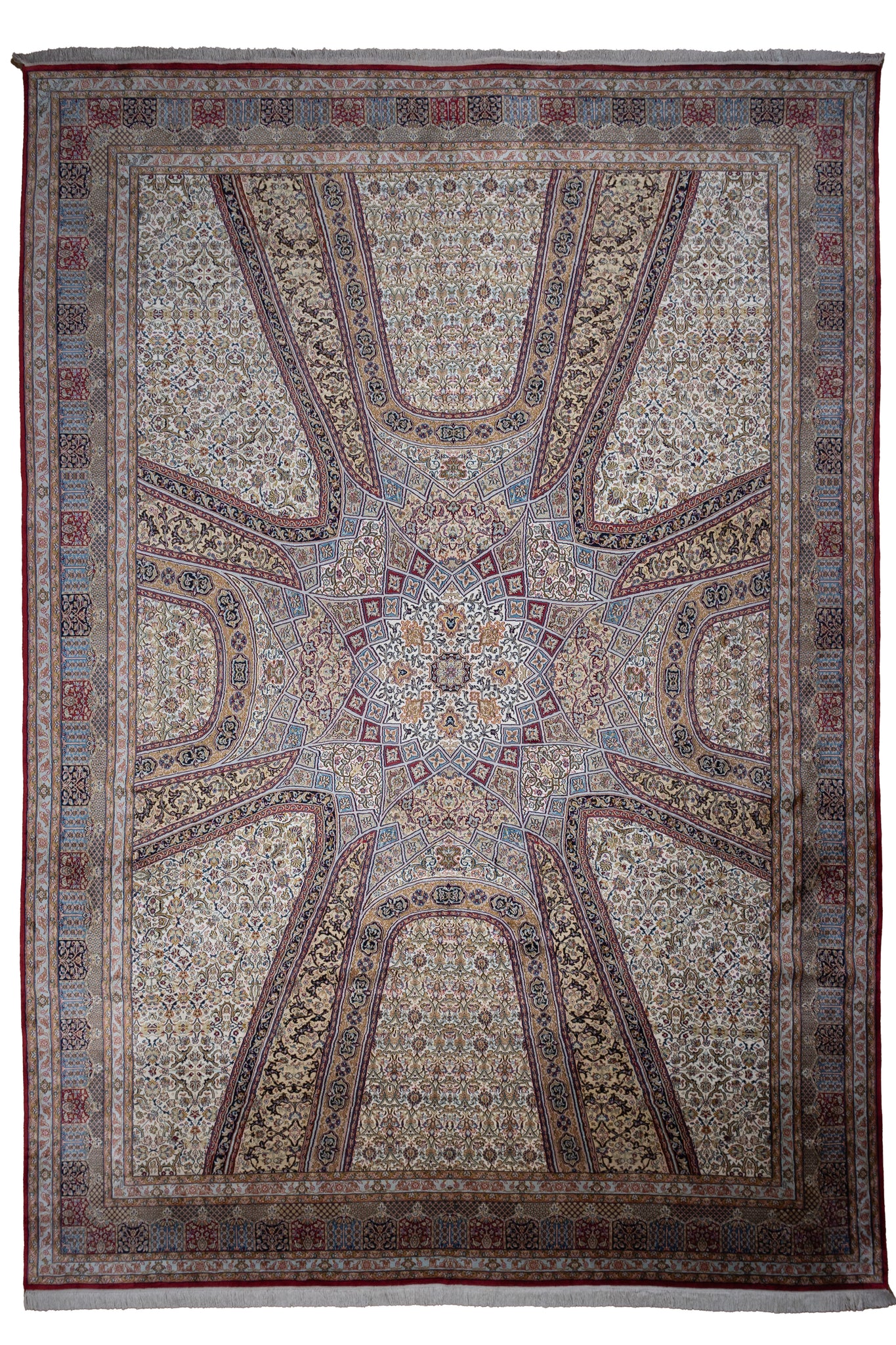 Inspired by the architectural splendor of Persian domes, this large silk-on-silk Kashmiri rug is a triumph of visual symmetry and meticulous craftsmanship. Hand-knotted with a remarkably high knot count, the rug unveils a celestial starburst medallion at its center—echoing the grandeur of mosque ceilings and Mughal vaults. Radiating from the core are intricately patterned "archways" that emulate stained-glass windows and tiled passageways, filled with floral motifs, geometric finesse, and cultural storytelling. Subtle hues of rose, cream, mocha, and cobalt shimmer across the surface, thanks to the premium mulberry silk used throughout. The multi-tiered border frames the design with regal precision, enhancing its gallery-like aura. This rug is not just a floor covering—it’s an architectural marvel translated into thread. Perfect for expansive interiors, this heirloom-worthy creation speaks to collectors and connoisseurs who seek timeless elegance, cultural depth, and extraordinary artistry woven into every inch. A true jewel of Kashmir.
