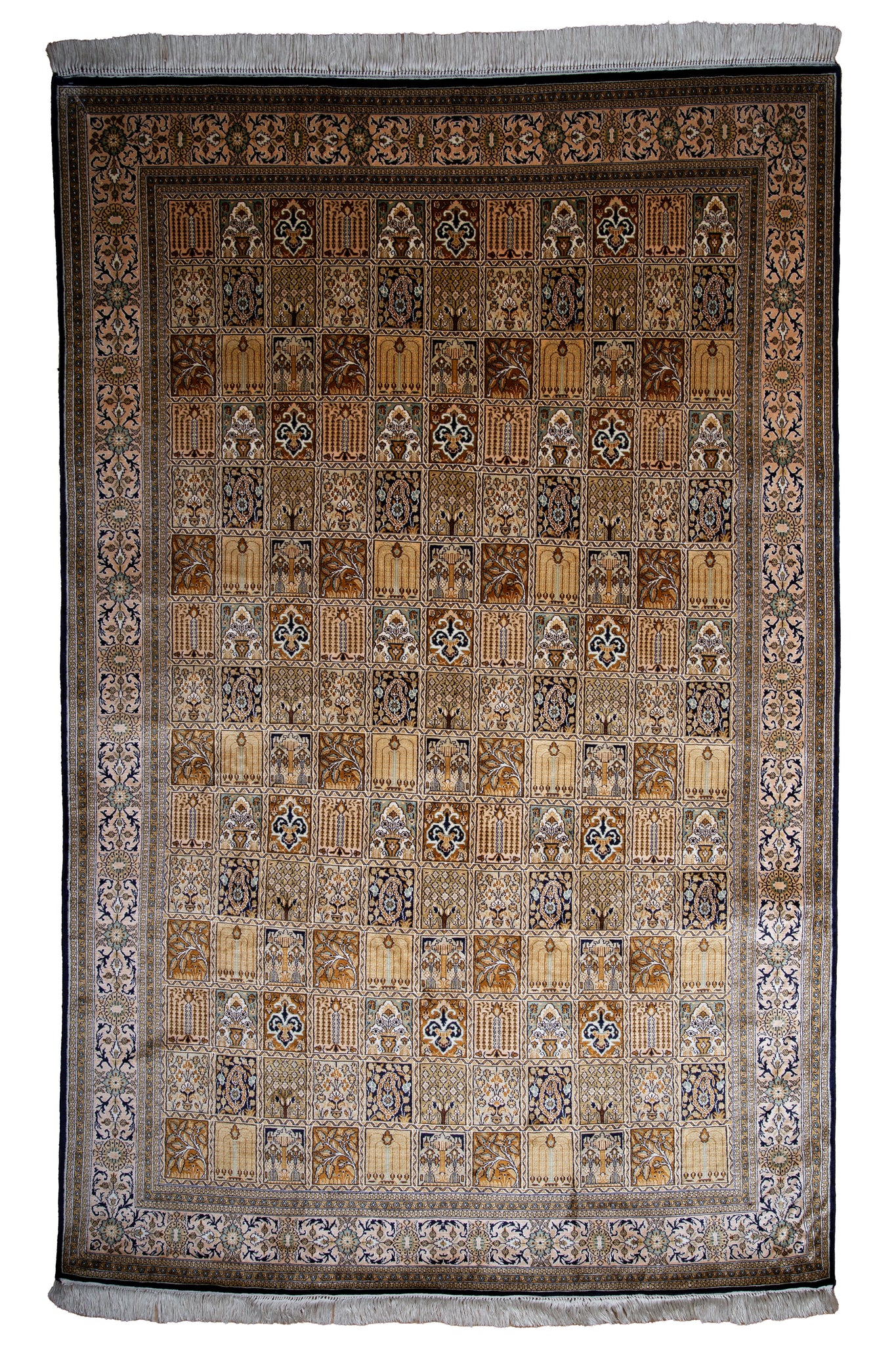 This exquisite silk-on-silk Kashmiri rug is a triumph of fine craftsmanship and artistic devotion. Featuring an intricate garden panel design inspired by Persian charbagh layouts, each compartment reveals a unique floral or architectural motif. Hand-knotted with an exceptionally high knot count using the finest mulberry silk, the rug offers unmatched clarity, texture, and luminosity. Rich shades of gold, ivory, and navy blue evoke the grandeur of Mughal palaces, while the subtle sheen adds regal warmth to any space. A collector’s jewel, this masterpiece embodies heritage and luxury—an heirloom destined to elevate interiors with timeless beauty and cultural sophistication.