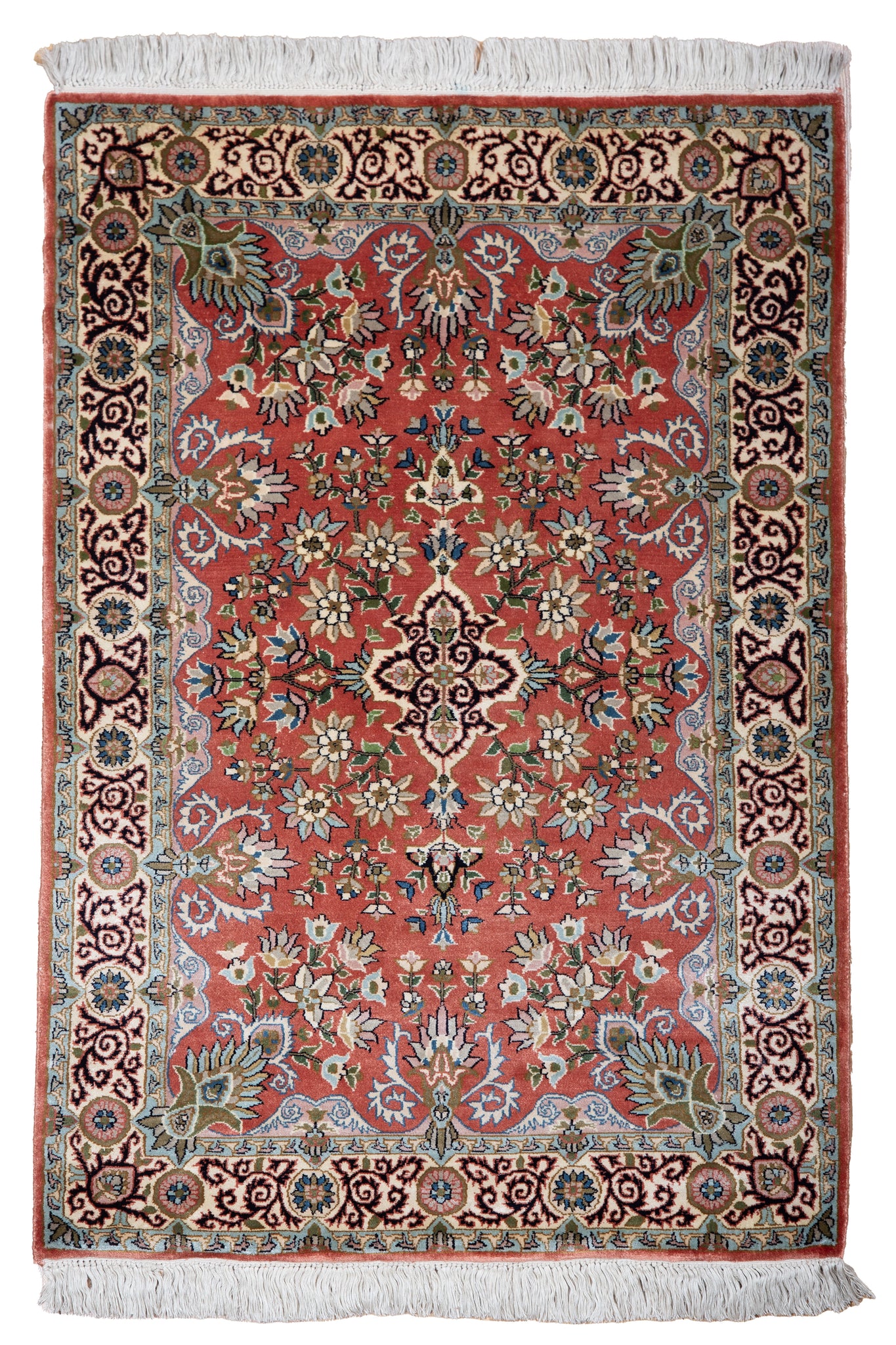 A radiant expression of Persian artistry, this Kashan silk-on-silk carpet dazzles with its vibrant persimmon red field and finely detailed floral composition. Woven entirely from natural silk, the rug boasts a luminous sheen and an ultra-soft texture that speaks to its exceptional craftsmanship. Delicate blossoms in ivory, sapphire, olive, and coral dance around a central rosette, framed by an elegant ivory border adorned with palmettes and arabesques. Each motif reflects centuries of design heritage from the legendary workshops of Kashan. Ideal for connoisseurs and curated interiors, this heirloom-quality masterpiece is both a visual delight and a tactile indulgence.