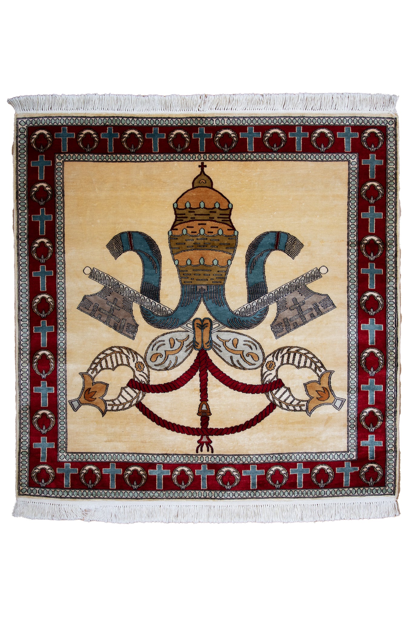 A rare fusion of sacred symbolism and Kashmiri artistry, this pure silk rug is a collector’s treasure steeped in spiritual grandeur. Handwoven by master artisans in Kashmir, the piece showcases the Vatican’s Papal insignia—ornately rendered with exceptional precision on a soft ivory silk field. The triple-tiered tiara, crossed keys, and crimson cord are framed by a border of crimson medallions and turquoise crosses, radiating both reverence and regality. The lustrous silk gives the artwork a dimensional glow, enhancing its sacred aura while inviting tactile admiration. Every knot reflects meticulous craftsmanship and devotion, with a weave so fine it resembles painting in silk thread. Ideal for wall display or ceremonial interiors, this rug transcends décor—offering a statement of faith, luxury, and legacy. A true testament to the confluence of religious iconography and time-honored Kashmiri weaving, this bespoke silk masterpiece is as spiritually profound as it is visually breathtaking. For the discerning collector of divine art.