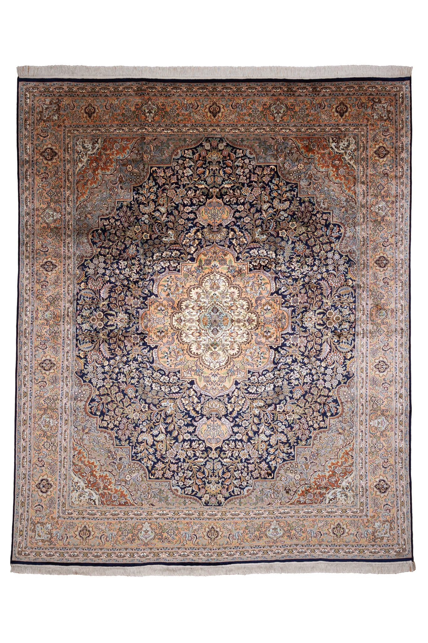 Immerse your space in regal elegance with this hand-knotted Kashan silk carpet, a true emblem of Persian heritage. Woven with exceptional finesse, its radiant medallion bursts from a field of intricate floral arabesques, framed by exquisitely layered borders in soft ivory, navy, and rust. The interplay of silk threads creates a mesmerizing sheen, enhancing every petal and vine. Revered for its symmetry and sophistication, the design echoes classical Kashan aesthetics—delicate, detailed, and deeply luxurious. Ideal for collectors and connoisseurs, this masterpiece offers timeless charm and unparalleled craftsmanship, making it an heirloom worthy of admiration and legacy.