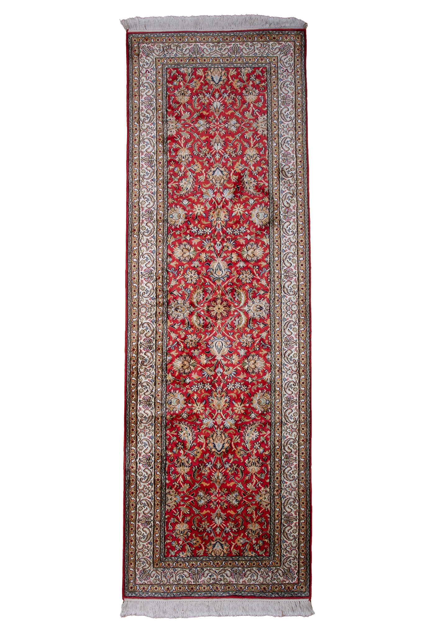 This elegant Kashmiri runner rug, masterfully hand-knotted in pure mulberry silk, brings regal charm to any hallway or narrow space. Its radiant crimson field is adorned with a rhythmic floral arabesque—each motif meticulously rendered in ivory, gold, and sapphire hues. The high knot count lends exceptional clarity to the intricate design, while the silk’s natural sheen elevates its opulence. Bordered with classical Kashan-inspired scrollwork, the composition is both balanced and bold. Designed to impress in transitional spaces, this runner is a refined expression of Kashmiri heritage, ideal for collectors who seek elegance, finesse, and timeless cultural artistry underfoot.