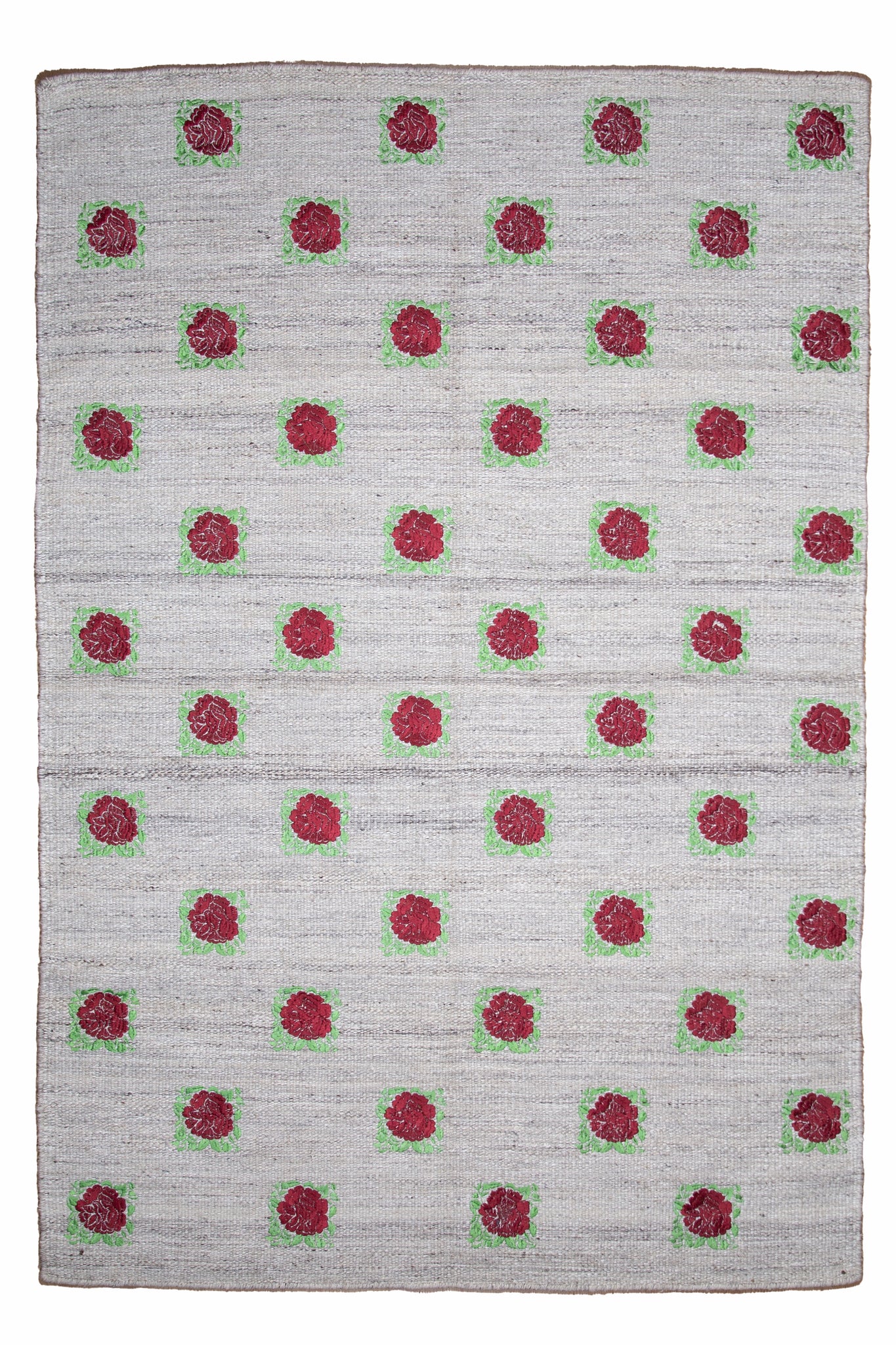 Charming and artisanal, this handwoven wool dhurrie features a playful yet elegant design of rose block motifs repeated in a rhythmic grid across a soft beige ground. Each crimson blossom is framed in vibrant green leaves, lending a fresh, garden-inspired energy to the composition. Crafted from pure wool using traditional flat-weave techniques, the dhurrie offers a durable, lightweight texture ideal for both casual and curated interiors. The natural tones and handcrafted character bring warmth and personality to contemporary, bohemian, or vintage-inspired spaces. A perfect blend of folk artistry and modern sensibility, this piece adds both cheer and craftsmanship underfoot.