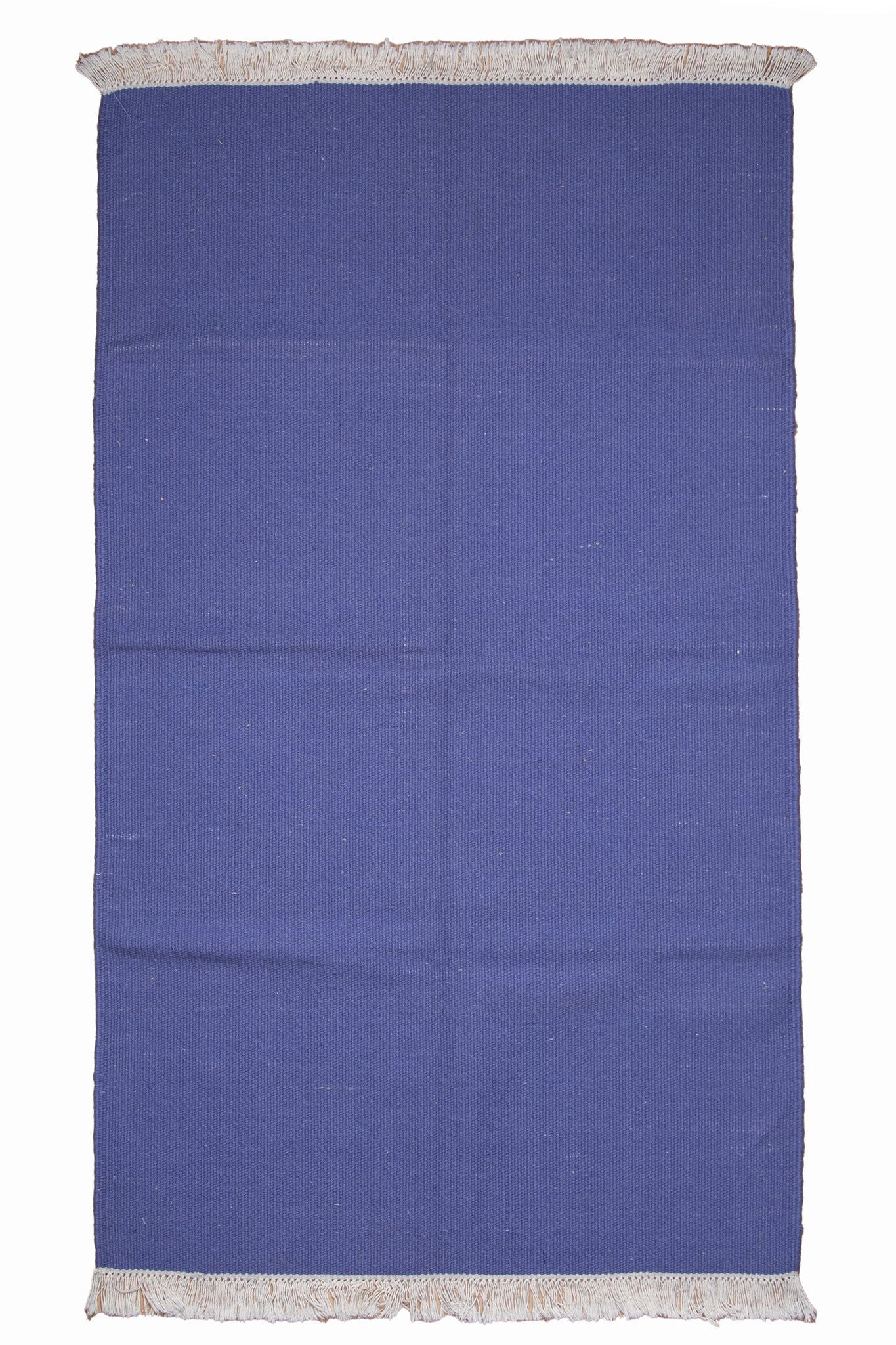 Simplicity meets sophistication in this handwoven wool dhurrie, drenched in a deep, elegant shade of indigo blue. Crafted by skilled artisans using time-honoured flatweave techniques, its minimal design emphasizes purity of form and richness of texture. The fine wool lends a soft yet durable finish, making it ideal for contemporary interiors seeking a touch of refined warmth. Subtle variations in weave enhance its handmade character, while ivory fringes add a classic finishing touch. Perfect as a grounding element in minimalist spaces, this dhurrie embodies understated luxury and timeless craftsmanship with a colour palette that exudes depth, calm, and quiet grandeur.