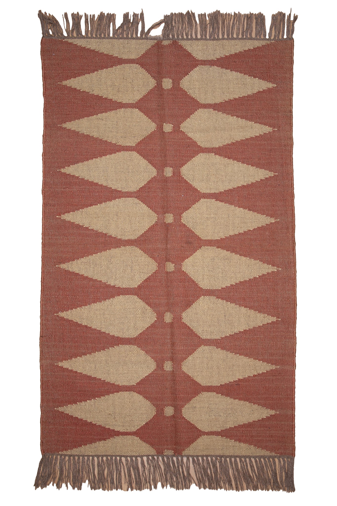 Bold yet earthy, this handwoven jute dhurrie features a rhythmic geometric pattern in rust red and natural beige tones. Each arrow-like motif points inward, forming a symmetrical dance of form and direction inspired by tribal symbolism. Handcrafted from durable, eco-friendly jute fibres, the dhurrie boasts a rustic texture and natural sheen, ideal for grounding minimalist or bohemian interiors. Its raw authenticity, paired with the organic colour palette, adds warmth and artisanal charm to any space. Finished with hand-knotted fringes, this piece is both a tactile experience and a design statement—perfect for collectors seeking understated luxury with an ethical, earthy soul.