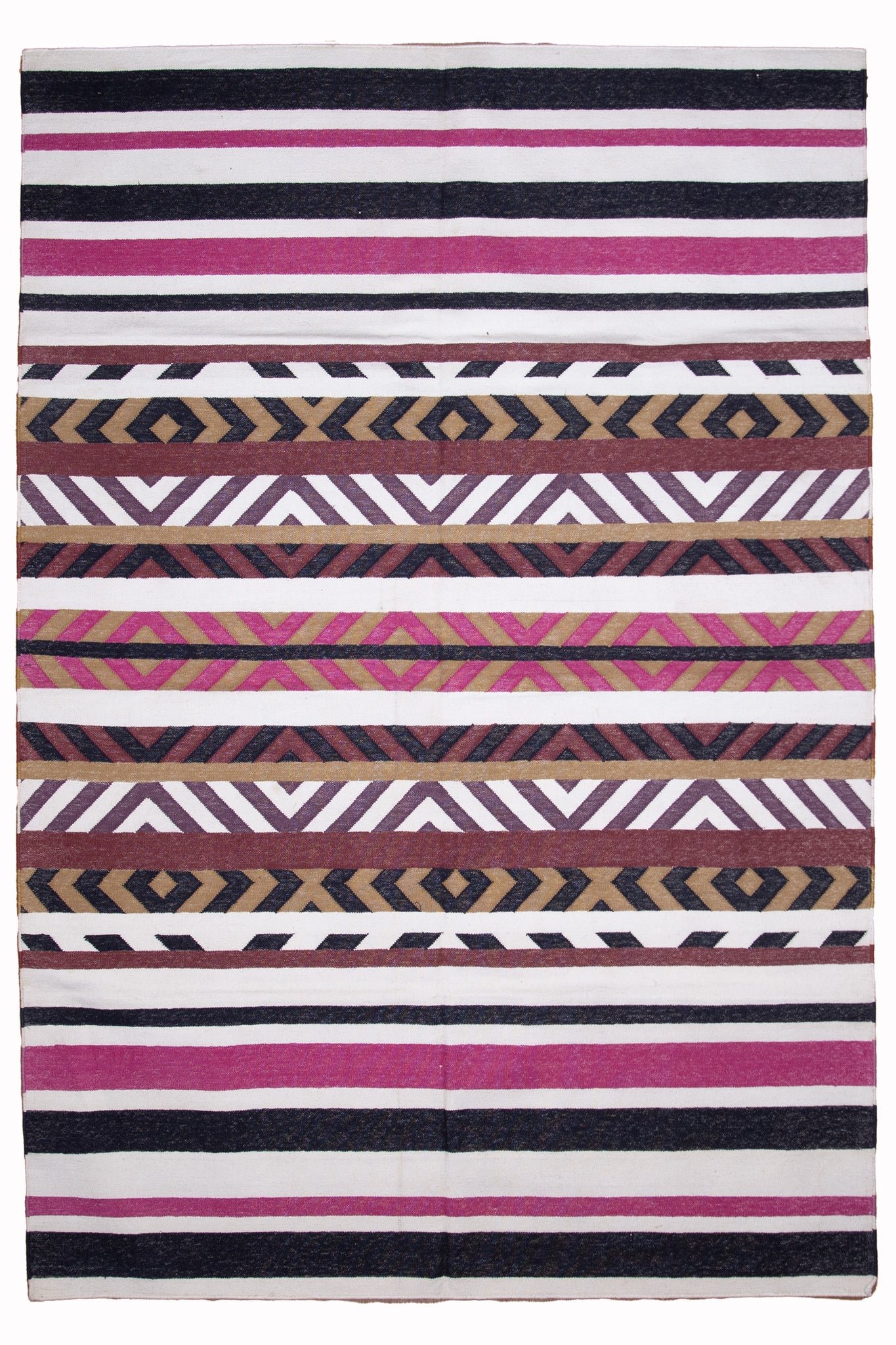 Bursting with bold personality, this handwoven cotton dhurrie is a celebration of vibrant geometry and skilled Indian craftsmanship. Deep magenta, earthy mustard, jet black, and creamy ivory stripes intersect with intricate tribal motifs, creating a visually arresting composition. The flatweave technique ensures a smooth, reversible surface perfect for contemporary and bohemian interiors alike. Each stripe and diamond is rendered with rhythmic precision, drawing inspiration from indigenous patterns and modernist art. Lightweight yet durable, this dhurrie effortlessly anchors any space with energy and warmth. A perfect choice for collectors seeking a statement piece that marries tradition with striking modern design.