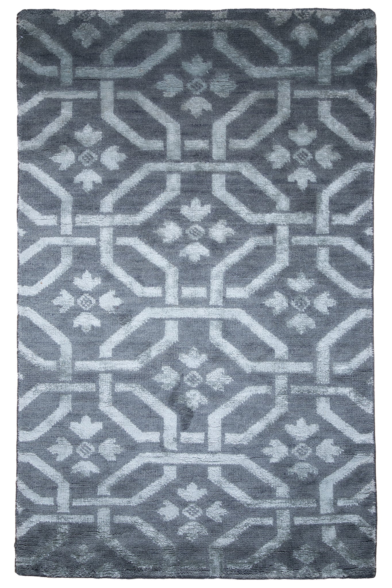 Elevate your home décor with this luxurious handmade wool and bamboo silk carpet, featuring a sophisticated geometric pattern in cool shades of grey and silver. Hand-knotted by skilled artisans, this rug blends the softness of wool with the subtle sheen of bamboo silk, creating a perfect balance of comfort and elegance. Its modern lattice design adds a touch of structure and style to contemporary interiors. Ideal for living rooms, bedrooms, or office spaces. Perfect for those searching online for modern handmade silk rugs, luxury wool carpets, or geometric area rugs —this piece is a timeless investment in art and function.