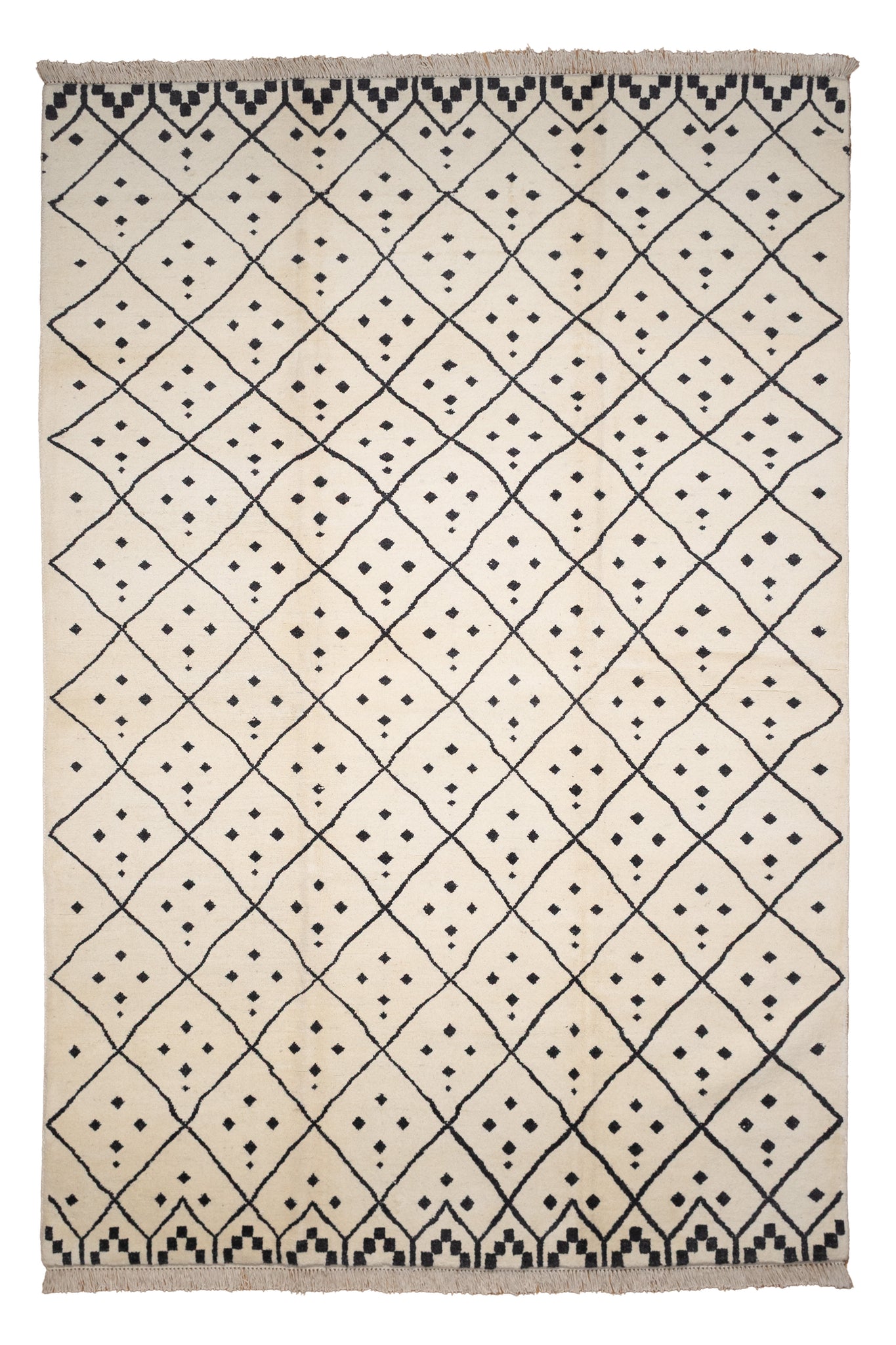 Inspired by traditional Moroccan Berber aesthetics, this Indian wool rug reinterprets tribal minimalism with refined craftsmanship. Handwoven from premium wool, its plush ivory base is overlaid with rhythmic black latticework and geometric dot motifs, forming a balanced, symmetrical pattern. The design’s simplicity is its strength—evoking both rustic heritage and modern elegance. Soft underfoot and striking in visual appeal, it complements everything from Scandinavian interiors to bohemian and eclectic spaces. This rug is a timeless nod to nomadic artistry, fused with Indian weaving mastery. Ideal for collectors and design purists seeking warmth, texture, and understated sophistication in one captivating piece.
