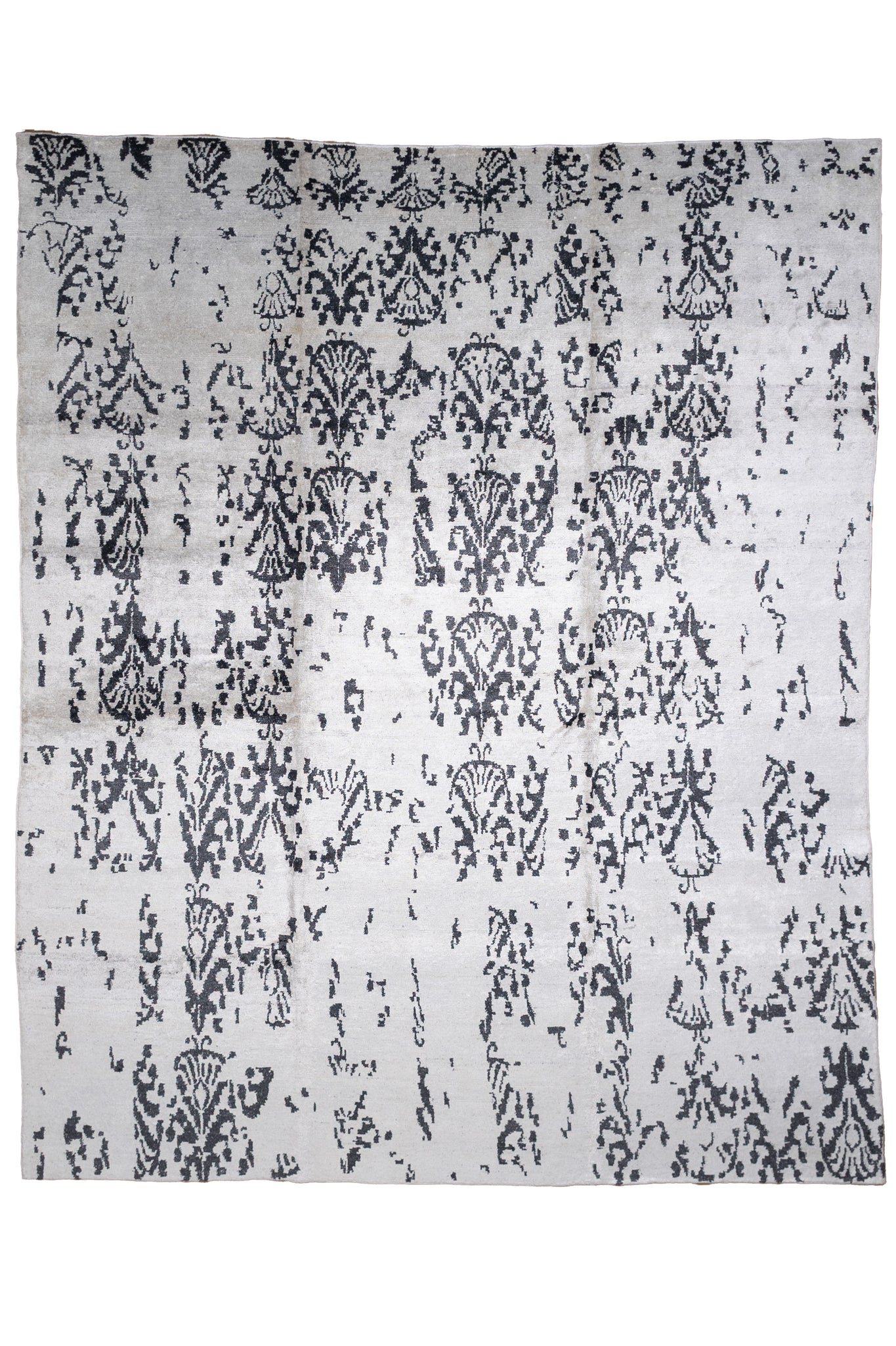 An elegant blend of old-world charm and modern subtlety, this hand-knotted wool and silk rug is a refined expression of contemporary luxury. Featuring a distressed damask pattern in deep charcoal over a soft ivory base, the design echoes faded frescoes and classical European textiles. The interplay of matte wool and shimmering silk lends depth, movement, and tactile richness. Meticulously crafted by master weavers, each knot reflects precision and patience. Ideal for minimalist or transitional spaces, this piece effortlessly anchors a room while whispering sophistication. A striking yet understated work of art for those who appreciate texture, tone, and timeless design.