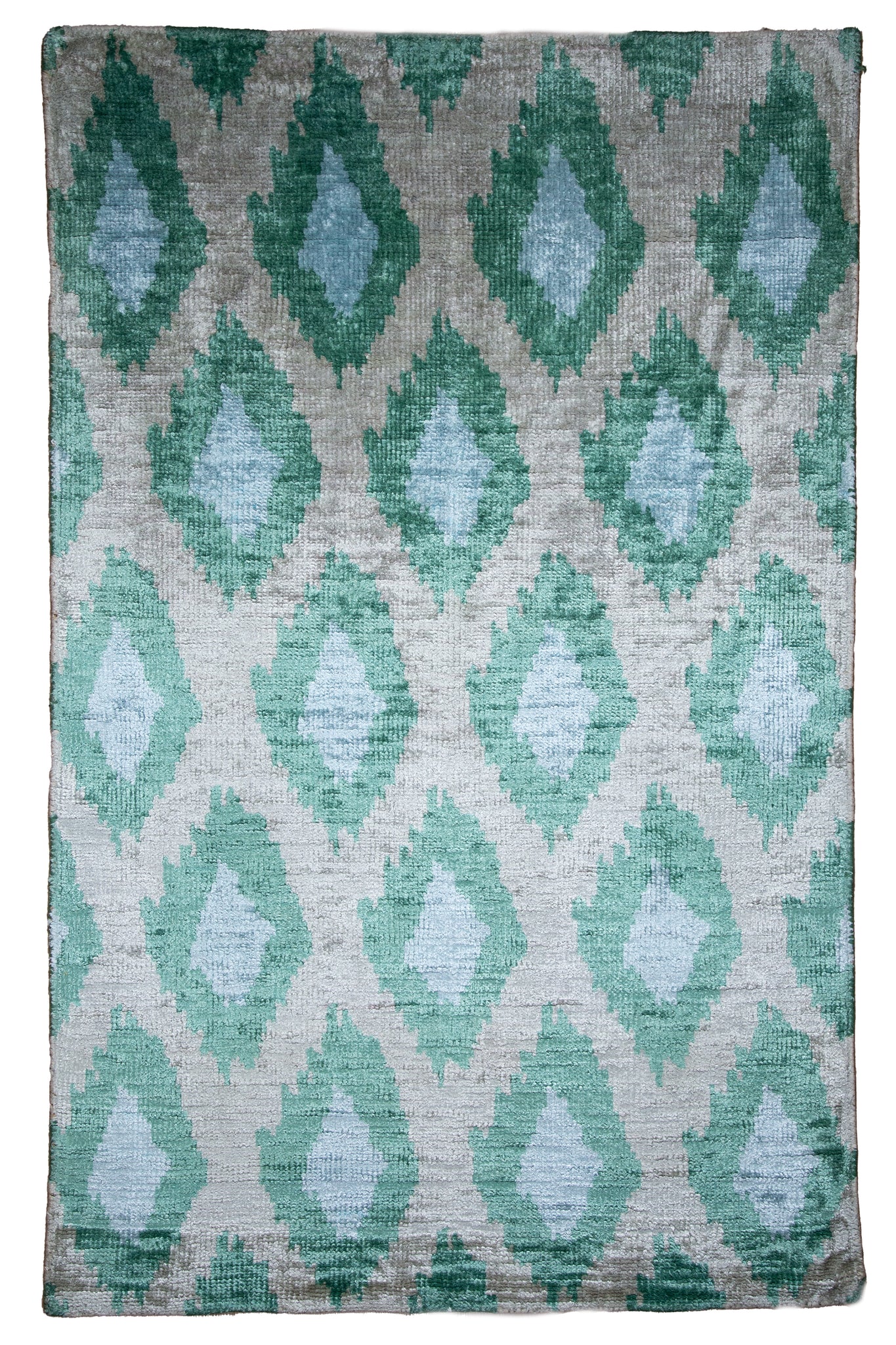 Step into luxury with the Verdant Echo Rug, a radiant bamboo silk carpet that blends natural sheen with striking design. Handwoven with care, this rug features an eye-catching diamond ikat pattern in vibrant shades of green and aqua on a soft beige base, creating a fresh yet elegant ambiance. The bamboo silk gives it a luminous finish and an irresistibly smooth texture underfoot. Perfect for chic living rooms, modern bedrooms, or elegant lounges, this rug elevates any space with its refined charm. Choose the Verdant Echo to bring color, class, and contemporary style to your home.