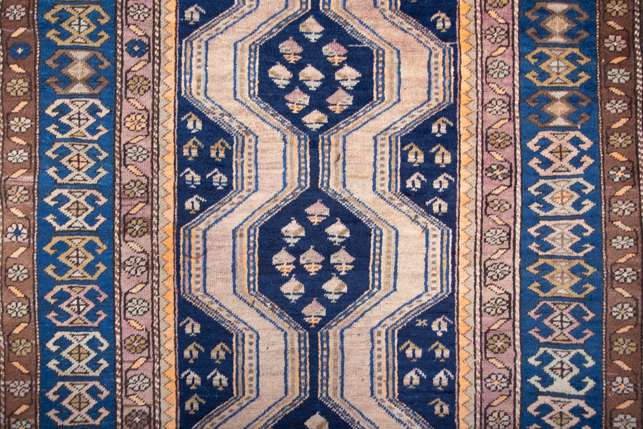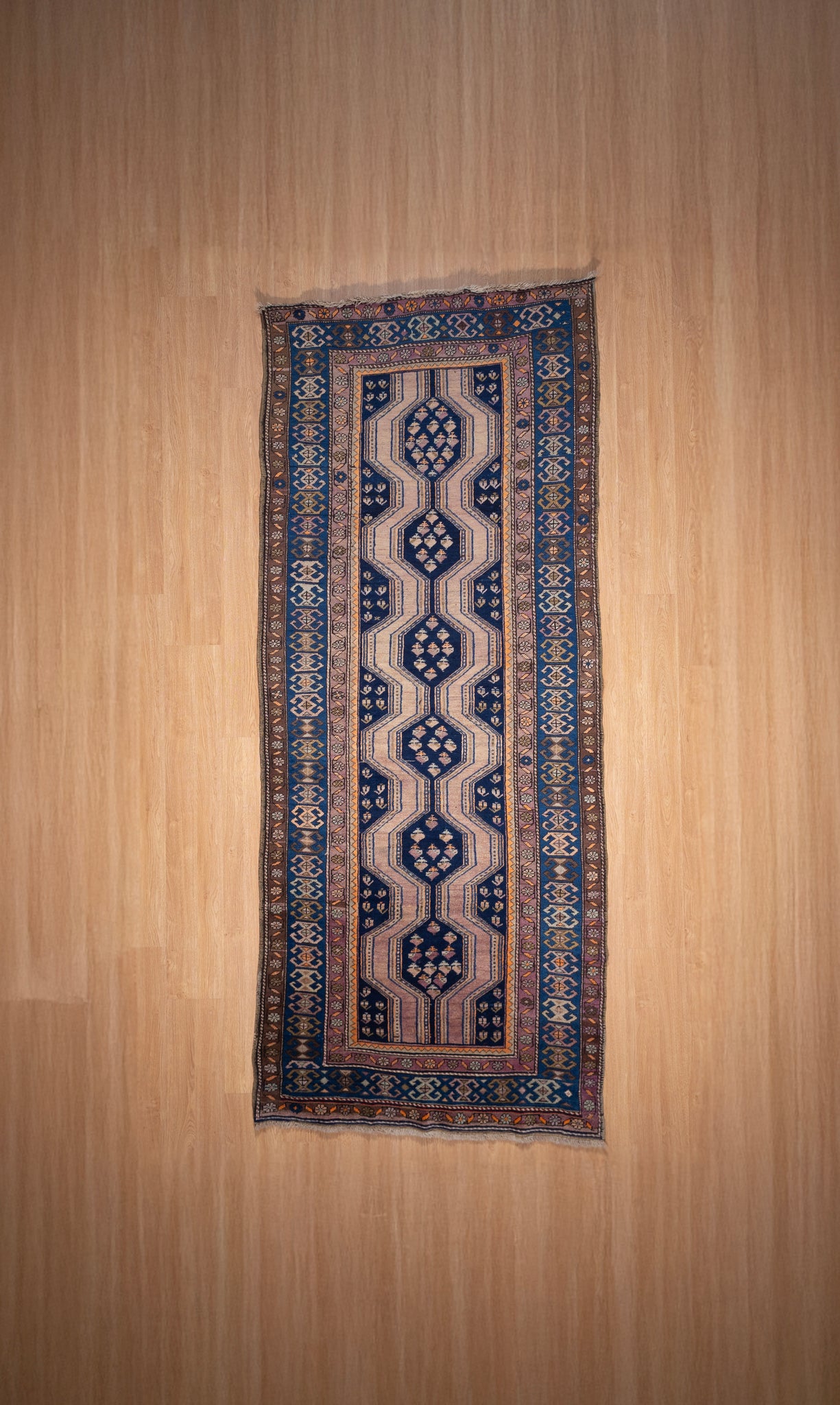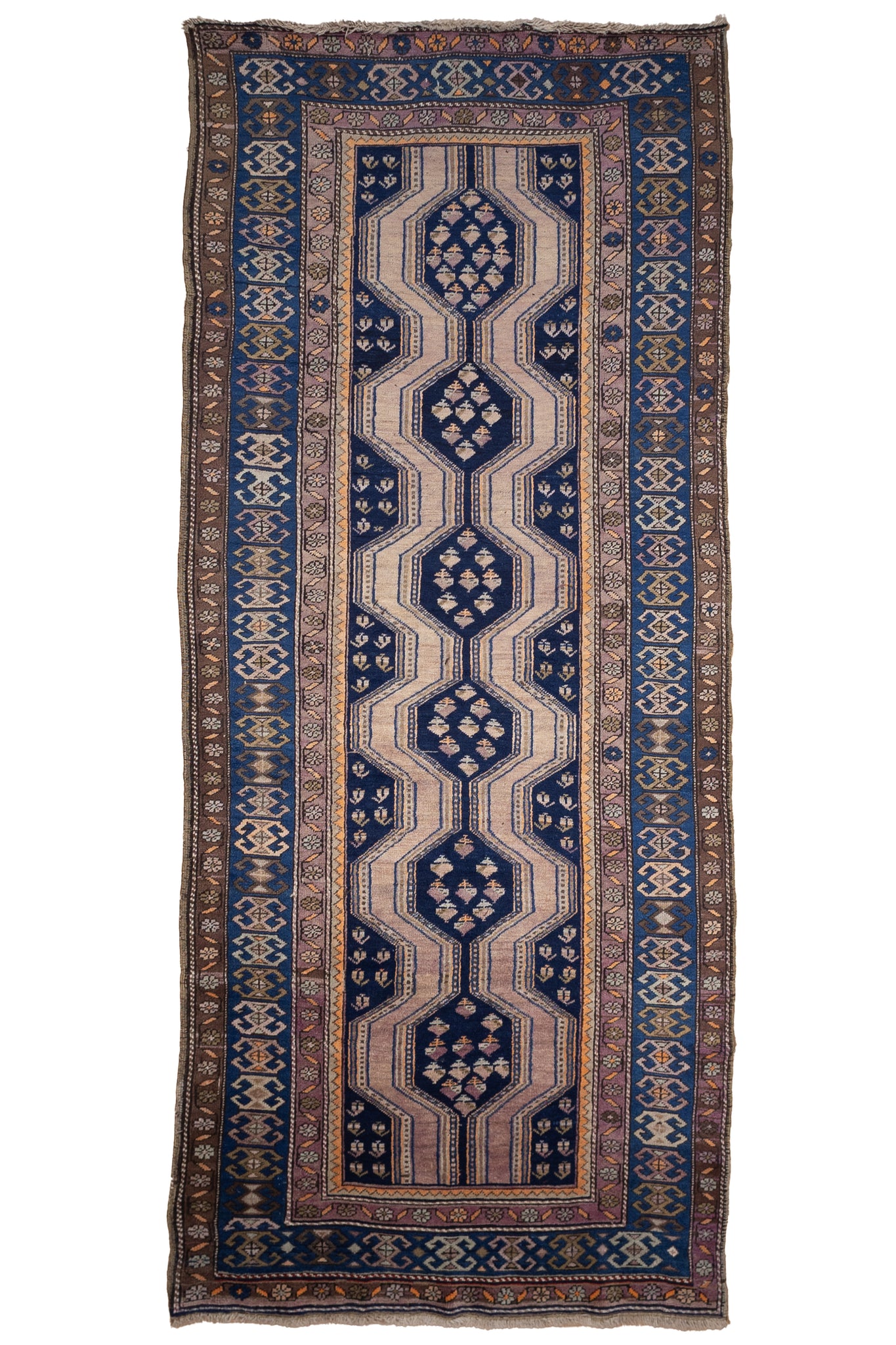 This antique Caucasian wool runner is a striking composition of tribal geometry and rich natural dyes, showcasing a central column of medallions with an undulating lattice design. The deep indigo field contrasts beautifully with soft beige, blush rose, and terracotta accents—each hue derived from age-old dyeing traditions. Handwoven using handspun wool, its dense texture and intricate motifs reflect the artistry of 19th-century Caucasian weavers. The zigzag inner frame and symbolic motifs lining the borders embody both protection and harmony. A sophisticated collector’s piece, this runner brings cultural depth, timeless design, and understated elegance to contemporary or classic interiors alike.