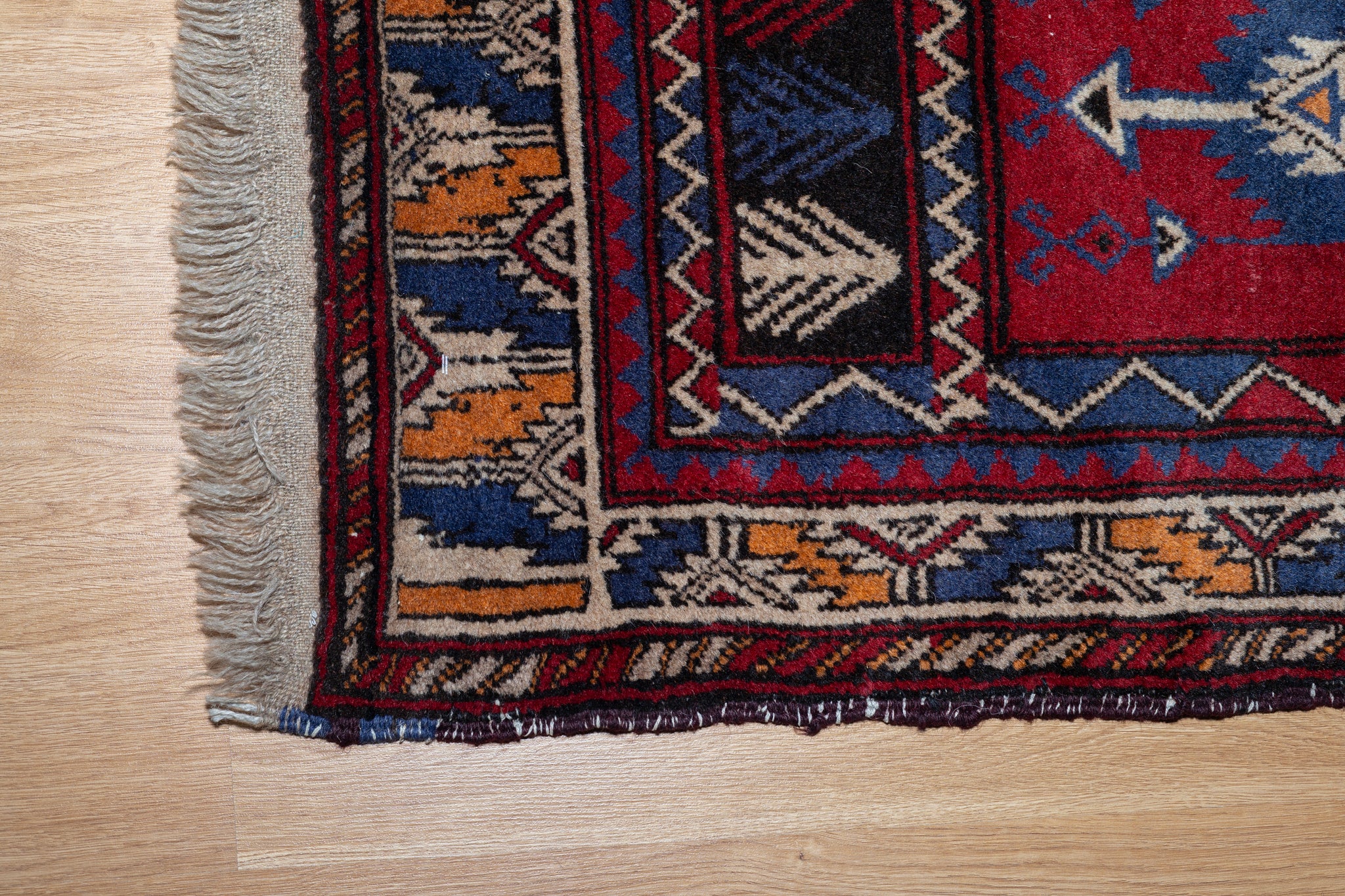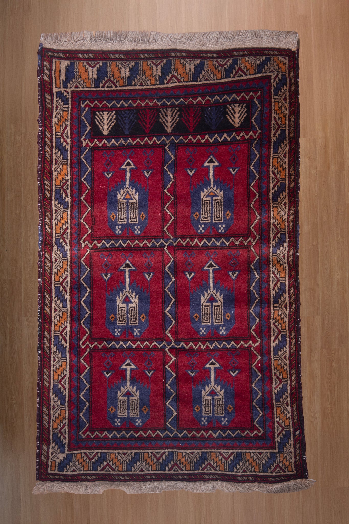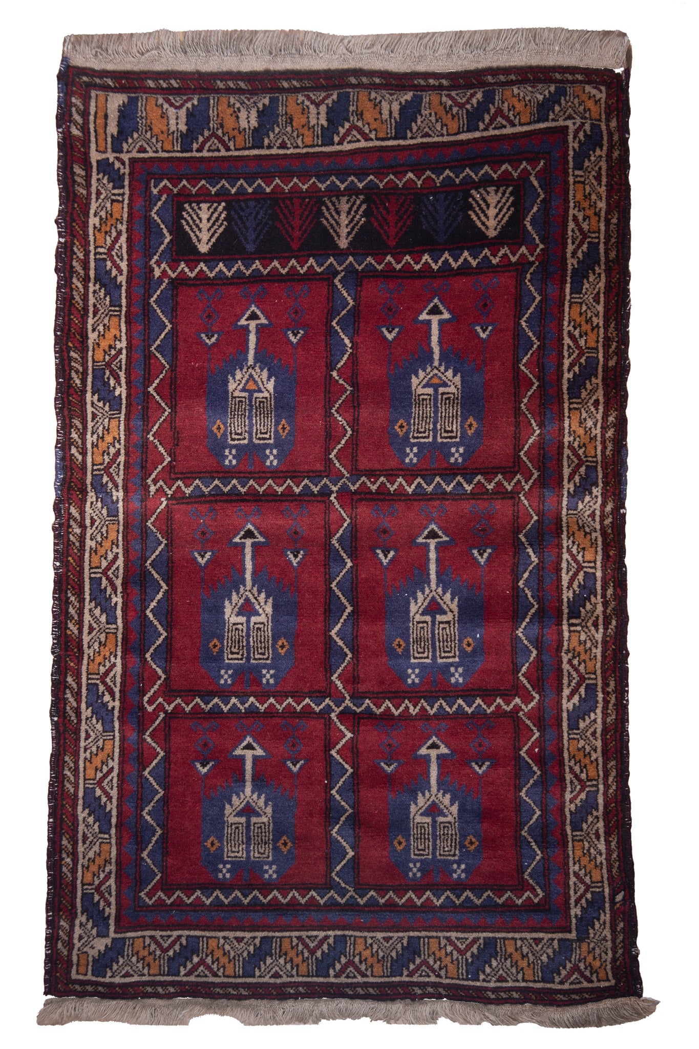 This antique Caucasian rug captures the essence of village life through symbolic artistry and tribal heritage. Hand-knotted in the Caucasus mountains using lustrous, hand-spun wool, its deep crimson and indigo fields are structured into four mirrored panels, each depicting a stylized house motif beneath an arrow-shaped tree of life. Surrounded by angular borders and wheat-ear guards, the composition reflects themes of home, fertility, and protection. The saturated natural dyes and bold geometric repetition reveal a masterful balance of symbolism and structure. Rich in folklore and texture, this piece is a rare, collectible treasure for connoisseurs of tribal elegance and authenticity.
