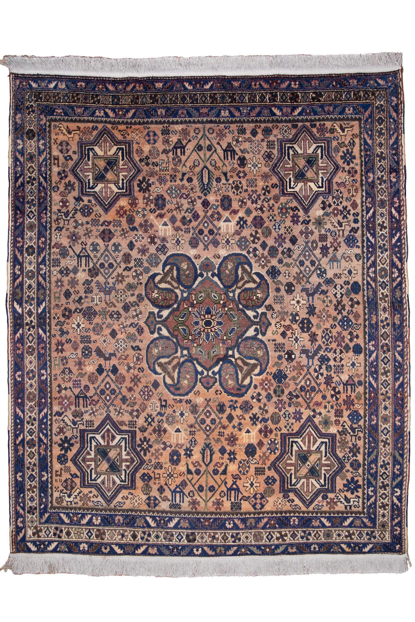 This exquisite antique Afshar tribal rug from Persia, over 100 years old, showcases the refined artistry of one of Iran’s most celebrated nomadic weaving traditions. Hand-knotted in lustrous wool with a consistent low pile, it features a central floral medallion surrounded by intricate latticework and geometric motifs. Star-shaped corner elements and scattered tribal symbols infuse the rug with a sense of rhythm and storytelling. The faded rose field is beautifully balanced by deep indigo, ivory, and earthy accents, lending the piece both depth and patina. A rare collectible, this rug embodies authenticity, heritage, and quiet elegance—perfect for connoisseurs and curators.