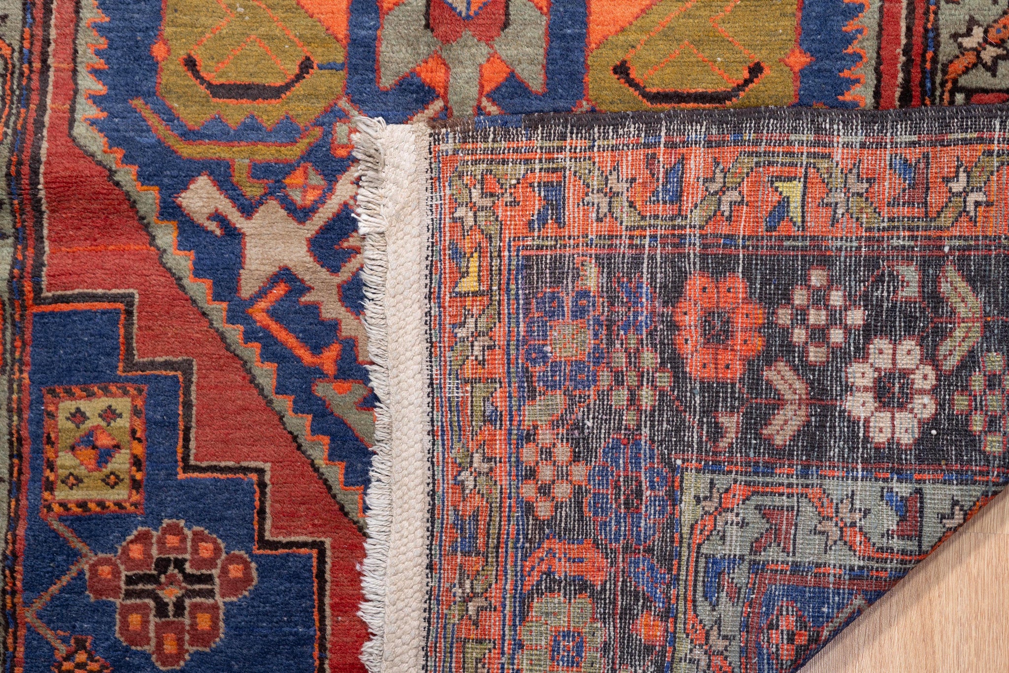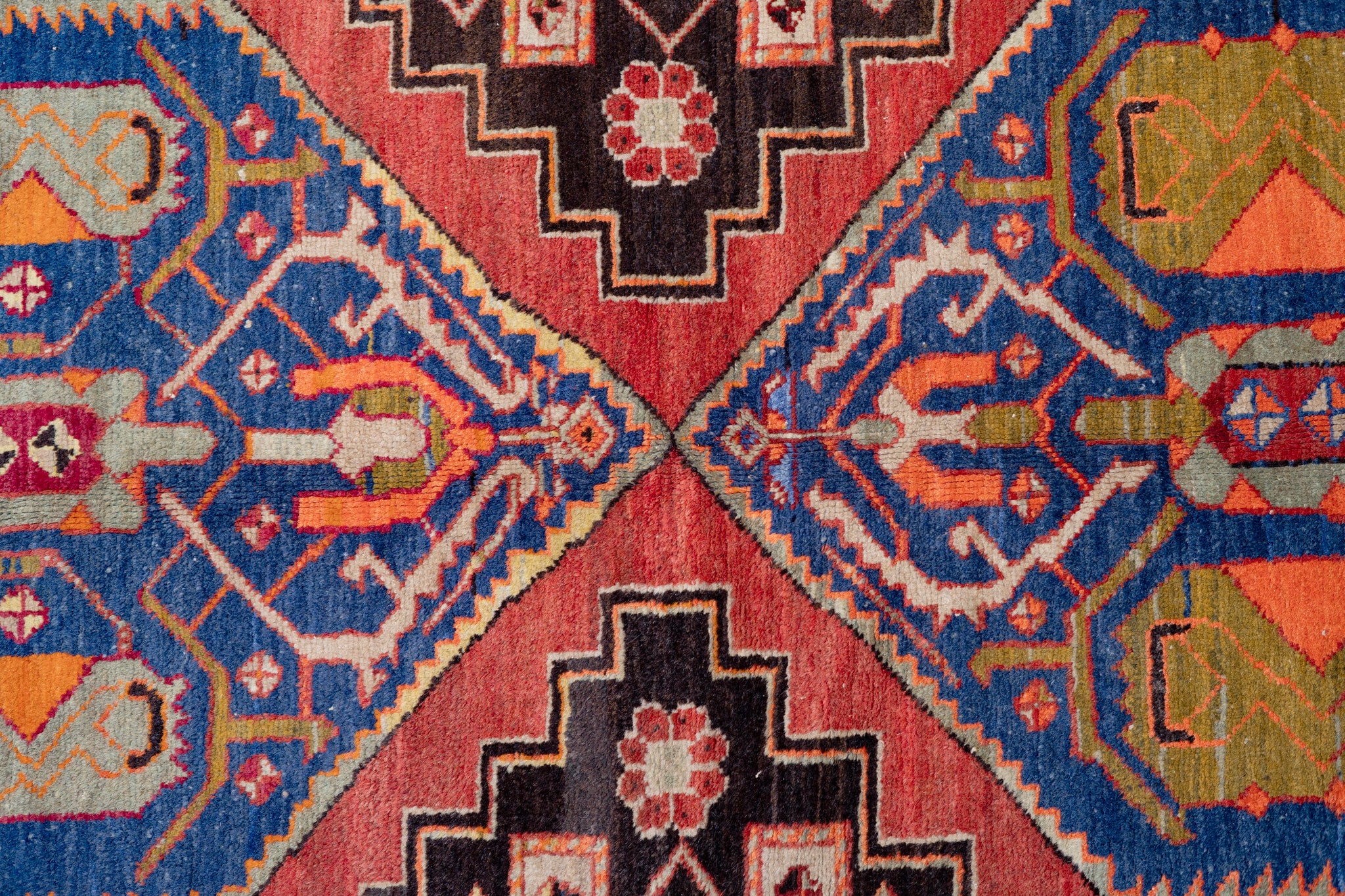 This exquisite antique Caucasian rug, dating to circa 1900, is a remarkably well-preserved example of tribal artistry from the Caucasus region. Handwoven in lustrous wool, it features two commanding hexagonal medallions anchored within a crimson field, surrounded by stepped motifs and angular tribal forms. The rich palette—indigo, coral, saffron, and ivory—retains exceptional vibrancy, framed by a chocolate-toned floral border that enhances its bold geometry. The weave is tight, the wool supple, and the design deeply symbolic—echoing the cultural narratives of mountain weavers. A rare collector's piece in outstanding condition, this rug embodies heritage, craftsmanship, and enduring visual drama.