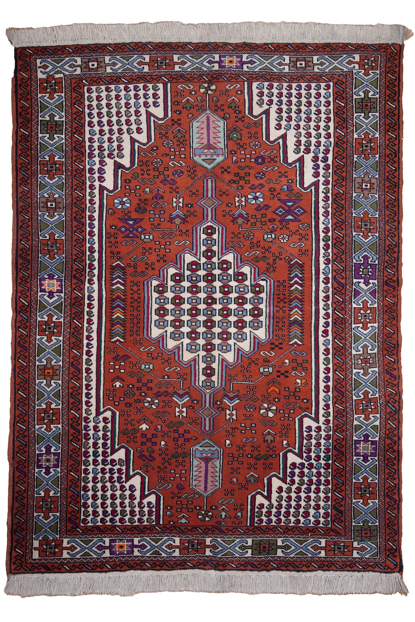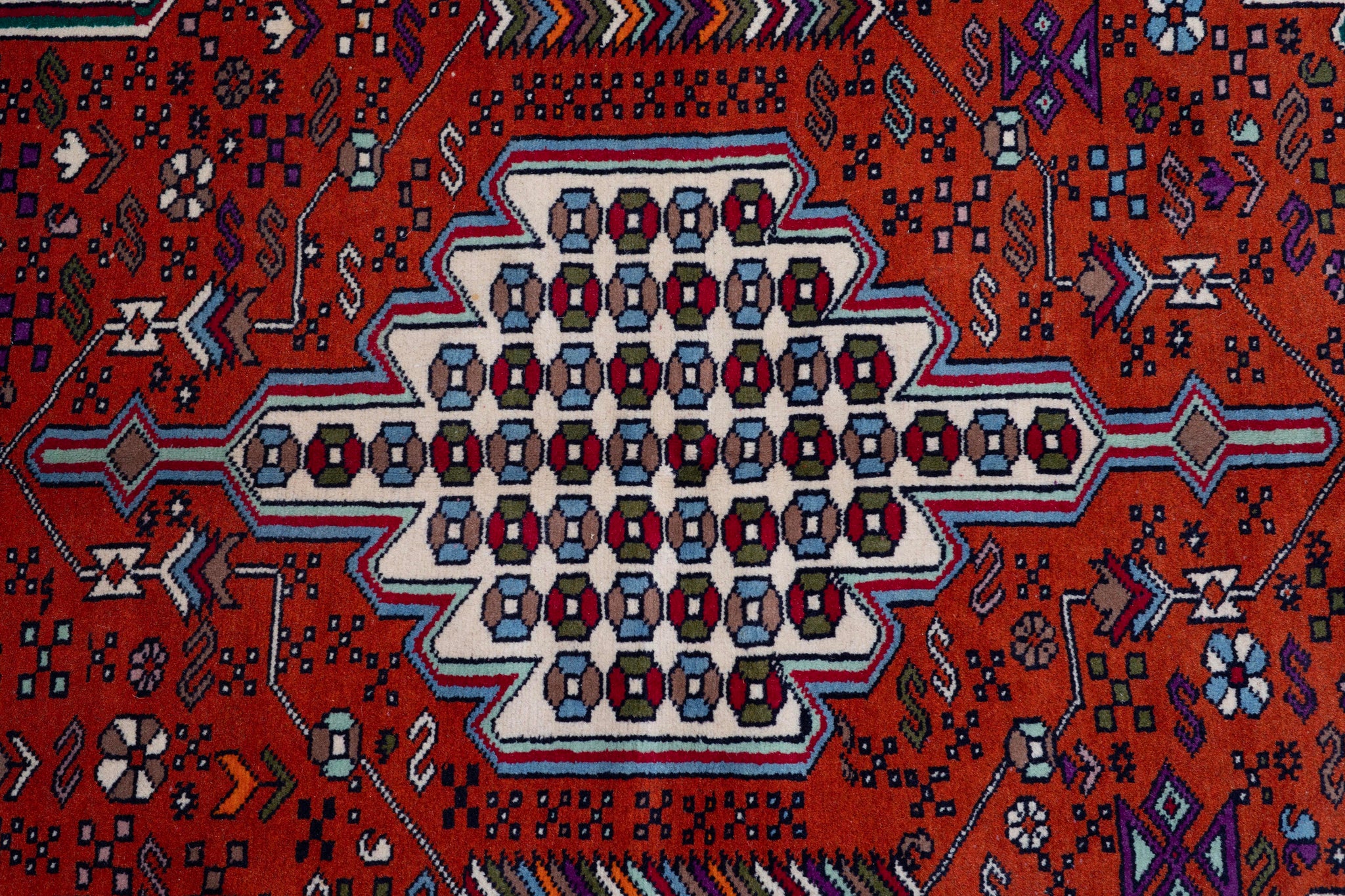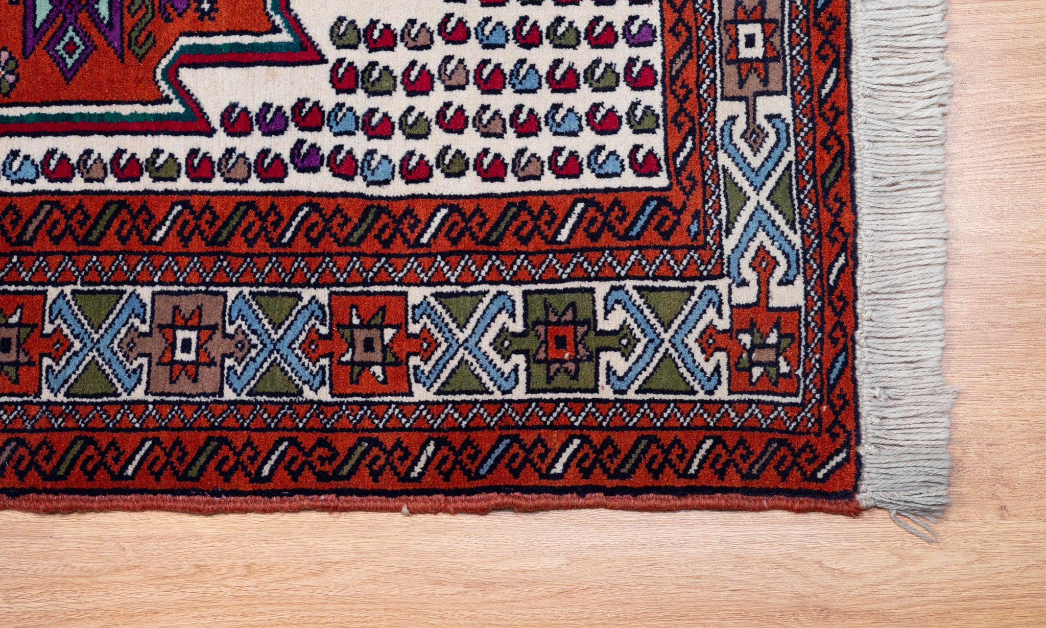 Radiating bold tribal energy, this handwoven Irani Baluch wool rug captivates with its fiery red field and sharply angular medallion. The stepped ivory corners and serrated motifs evoke mountain peaks and ancestral protection symbols, framed by intricate borders in plum, lilac, and cobalt blue. Each knot is crafted with high-grade wool, creating a dense, soft texture that balances durability with elegance. The palette’s vivid contrast and stylized geometry reflect the nomadic Baluchi spirit—an homage to movement, strength, and story. Ideal for collectors and interiors seeking cultural depth, this rug is not just a textile, but a piece of enduring heritage.