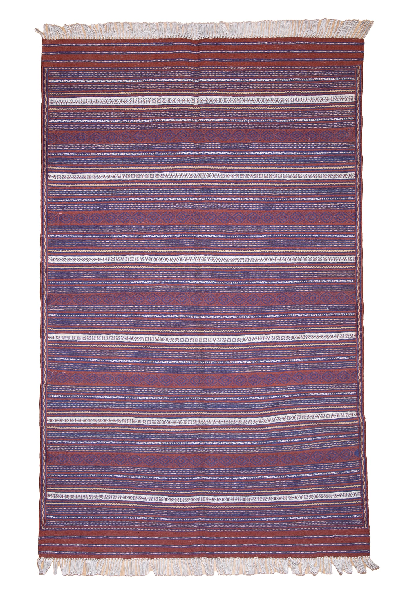 Woven in the spirit of tribal legacy, this Maliki kilim celebrates the rhythm of nomadic life through its bold, harmonious stripes. Handwoven using hand-spun wool and natural dyes, the piece showcases alternating bands of crimson, indigo, ivory, and ochre—each line echoing ancient migration routes and woven symbolism. Geometric borders and intricate patterns are subtly integrated, creating movement without overwhelming the senses. Lightweight, durable, and entirely flatwoven, this kilim is both functional and decorative, perfect for layering or wall display. A collector’s piece rooted in heritage, it embodies the strength and subtlety of Maliki craft at its most timeless.