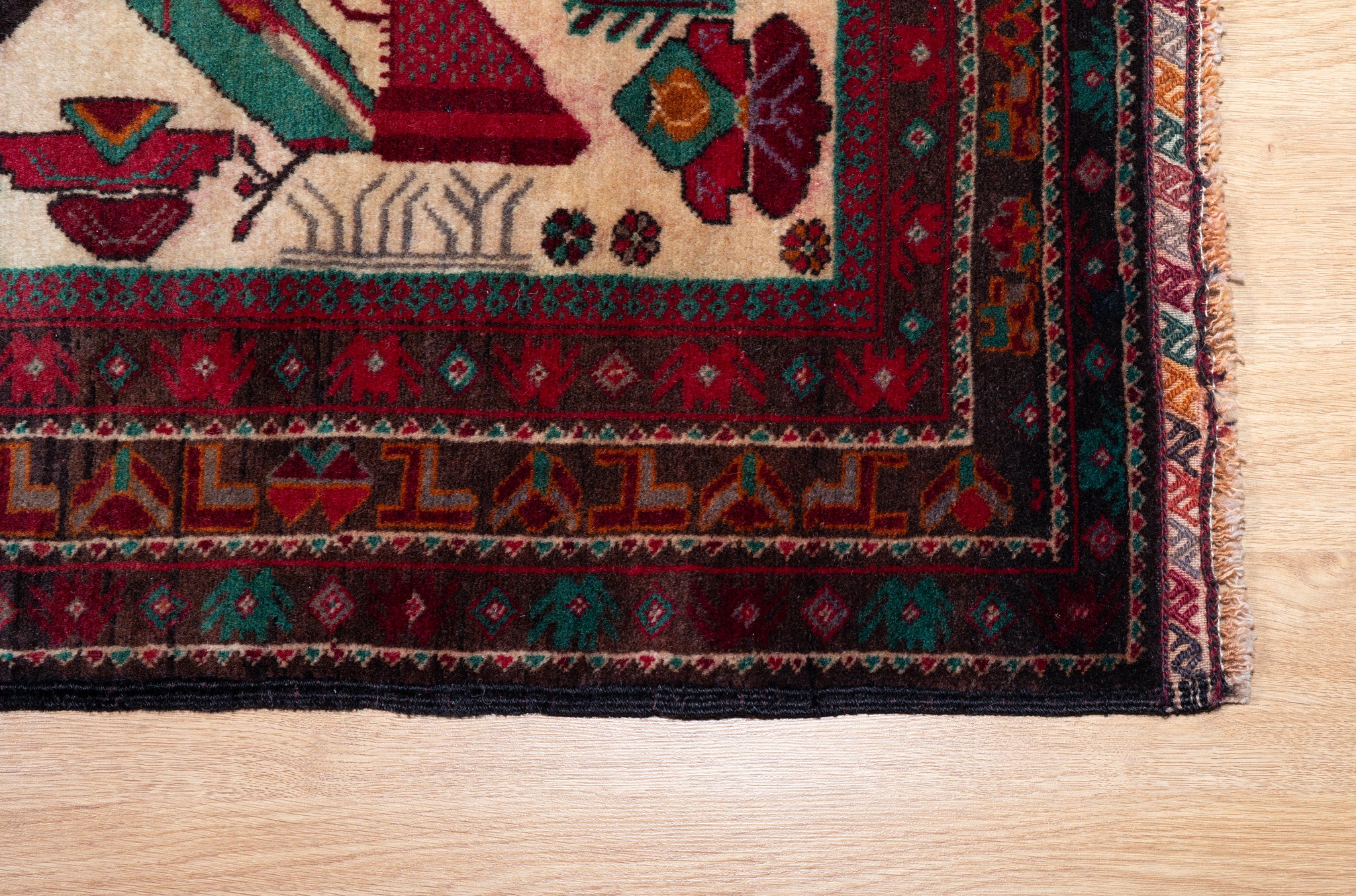 A rare expression of folk artistry, this antique Afghan rug features a compelling central portrait surrounded by rustic village motifs—trees, livestock, and architectural forms—each rendered in hand-dyed wool with symbolic precision. Woven with a high knot count and natural dyes, its palette of earthy reds, olives, and ochres exudes a vintage patina that speaks of age and authenticity. This piece blurs the line between tapestry and storytelling, offering not just decor, but cultural narrative. Ideal for collectors and connoisseurs, it is a window into tribal identity and heritage, bringing history, warmth, and individuality into any discerning interior space.
