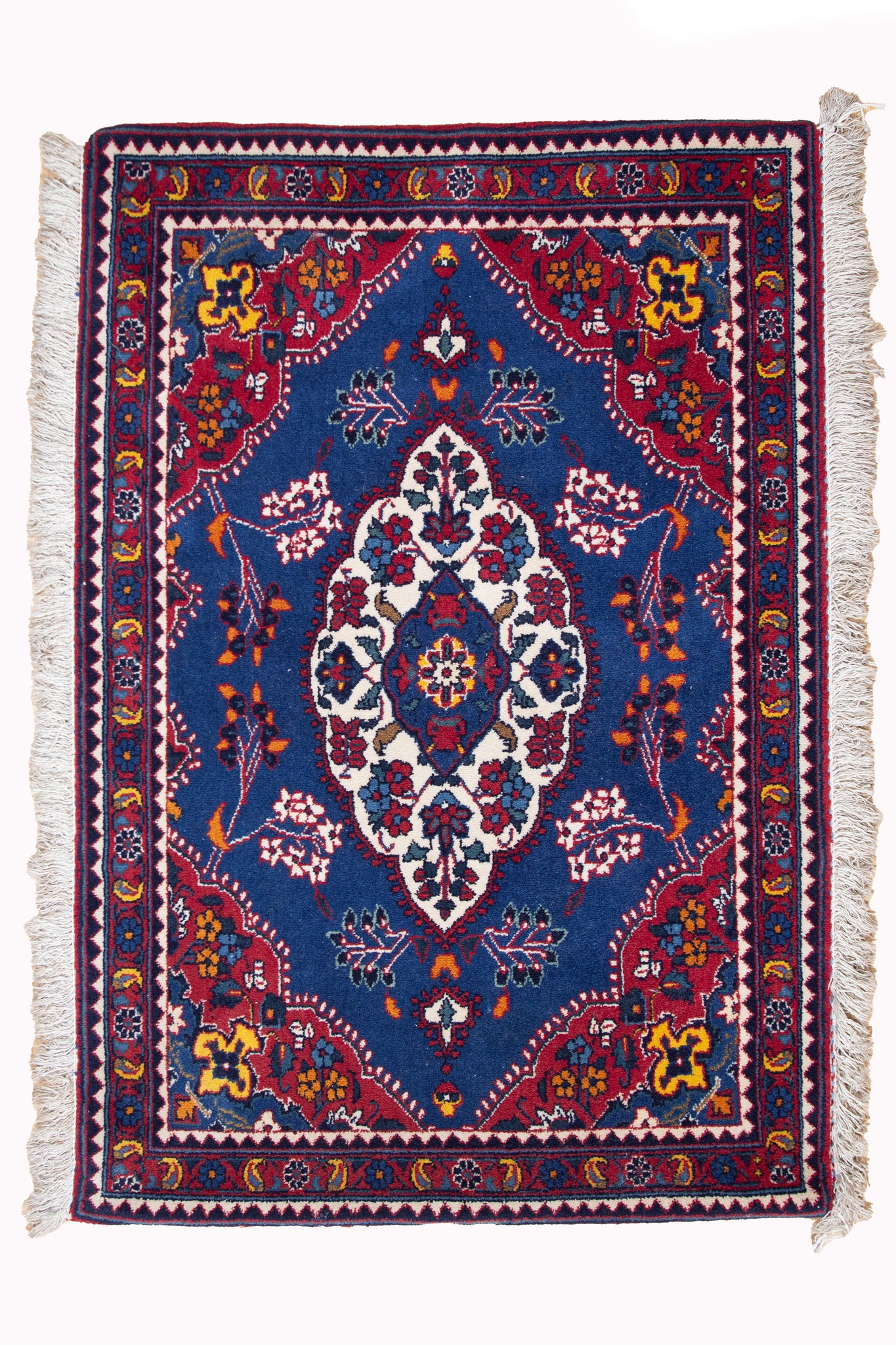 This radiant Afghan rug bursts with artistic vitality, featuring a bold sapphire-blue field anchored by a central medallion of ivory and crimson floral motifs. Inspired by Persian garden designs, its handwoven beauty captures a balance of elegance and exuberance. The vibrant palette—highlighting ruby reds, golden ochres, and midnight blues—is brought to life through natural dyes and handspun wool. Each detail, from the delicate vine scrolls to the ornate corner spandrels, reflects generations of nomadic craftsmanship. Perfect for collectors and lovers of statement decor, this rug transforms any space into a celebration of heritage, colour, and timeless Afghan artistry.